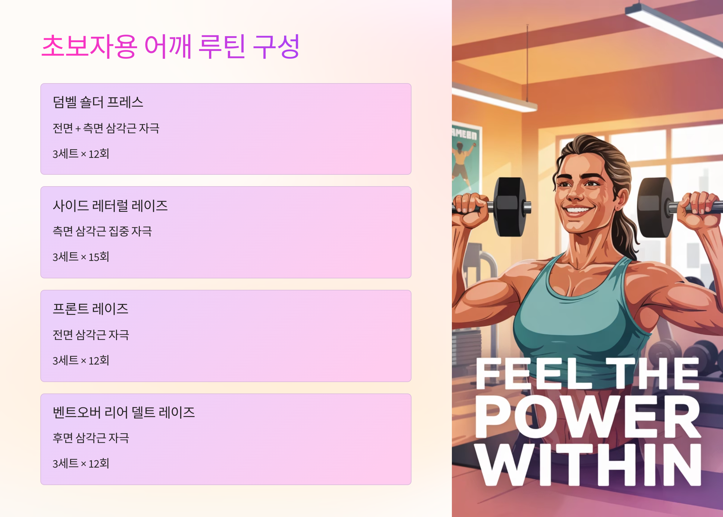 이제 어깨가 준비됐다면 본격적인 초보자용 어깨 운동 루틴을 소개할게요! 가장 기본이면서도 효과 좋은 구성으로 알려드릴게요. 💯