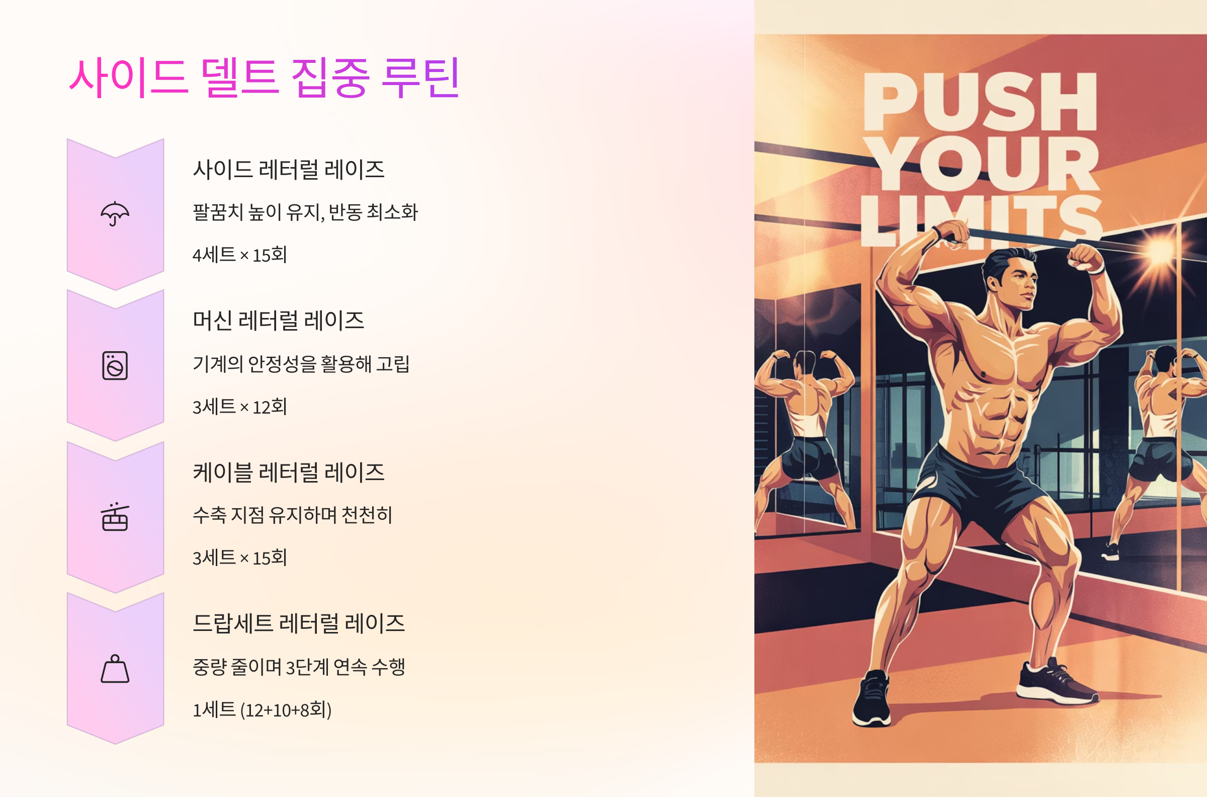 사이드 레터럴 레이즈는 중심 운동이고, 후반에는 머신 레터럴 레이즈나 케이블 레터럴 레이즈로 자극을 끝까지 밀어주면 좋아요. 마지막엔 드랍 세트까지 도전해보세요! 🔁🔥