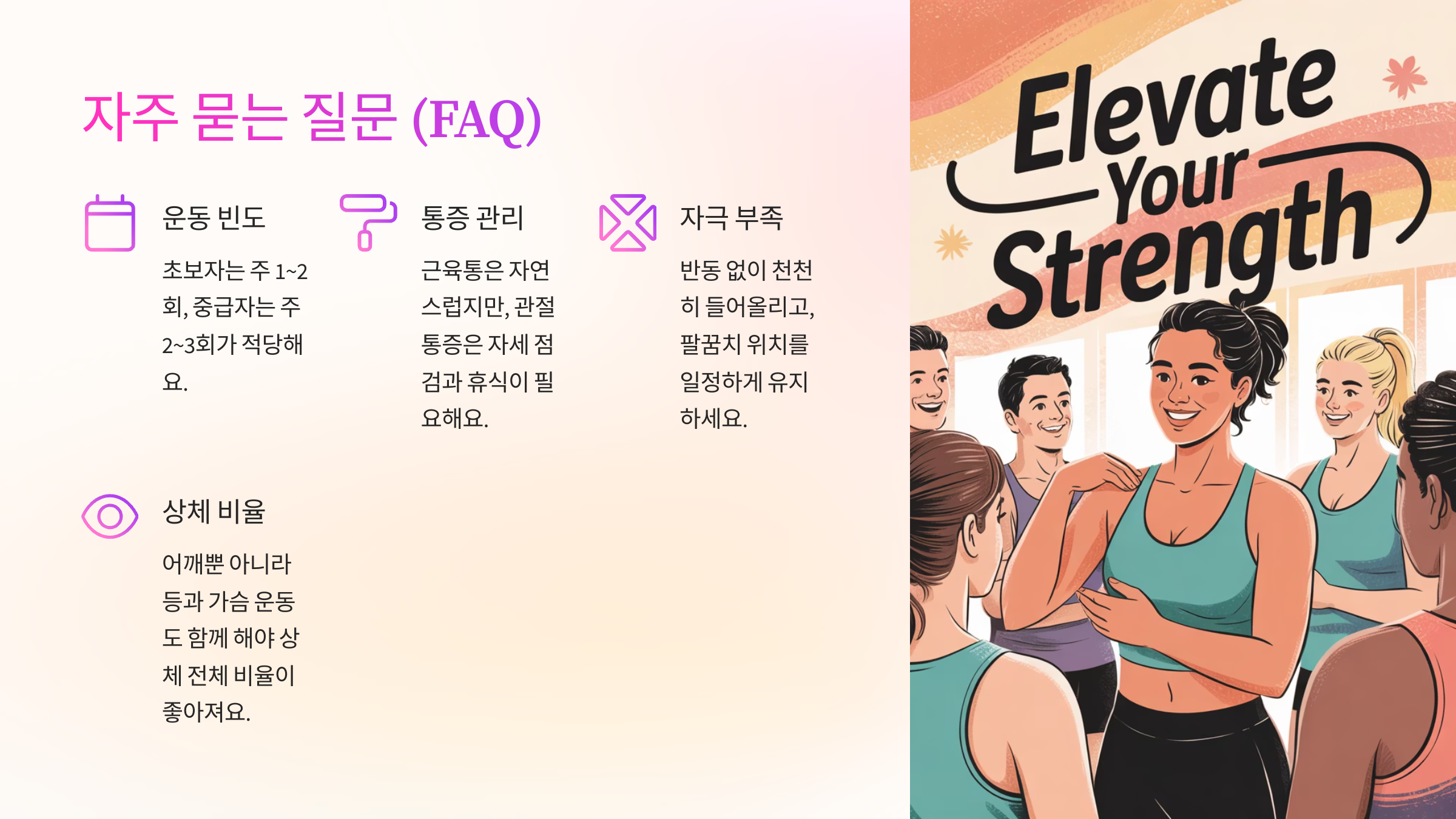 이제 루틴 구성부터 주간 분할까지 완성됐어요! 마지막으로, 어깨 운동에 대한 자주 묻는 질문 8가지를 FAQ로 깔끔하게 정리해드릴게요. 🙋♂️