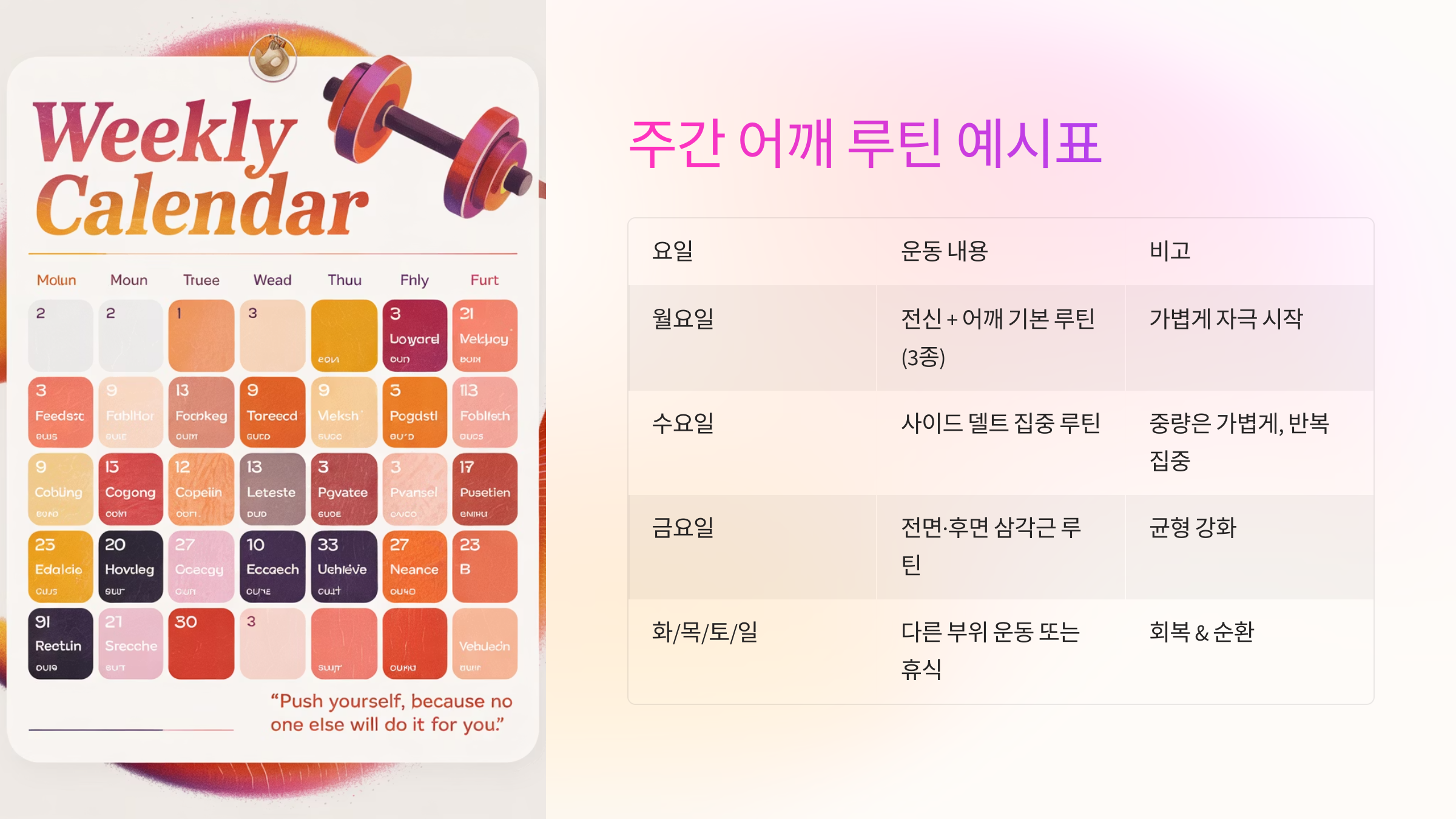 이제 다양한 부위를 커버할 수 있는 루틴들을 알게 됐어요! 다음은 일주일 단위로 어떻게 어깨 운동을 배치할 수 있는지 '주간 루틴 예시표'로 정리해드릴게요. 🗓️