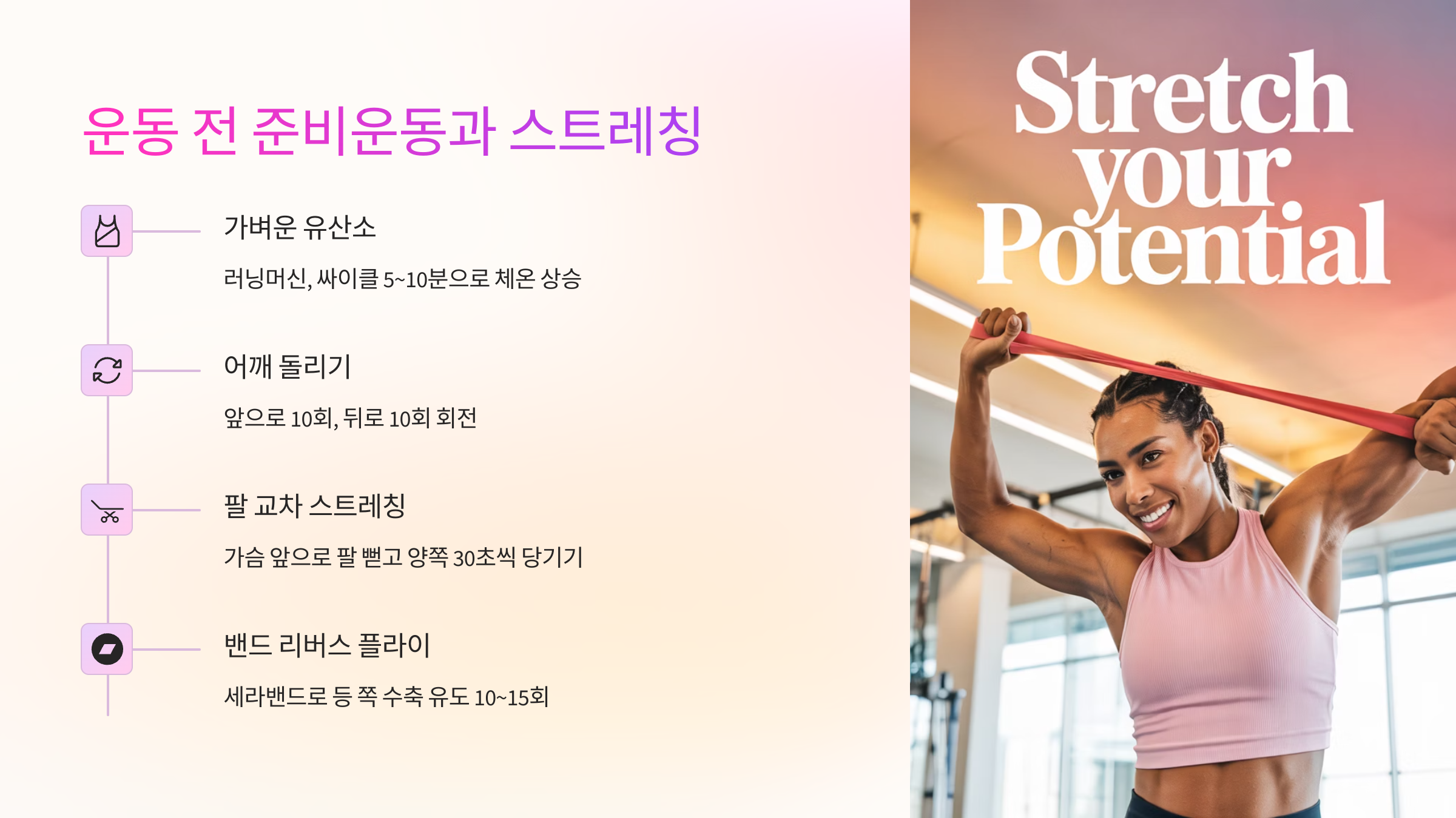 다음은 부상 방지를 위해 꼭 필요한 '스트레칭과 워밍업'을 소개할게요! 준비운동 없이 바로 무게부터 들면 어깨 통증이 찾아올 수 있어요. 🙆♂️🔥