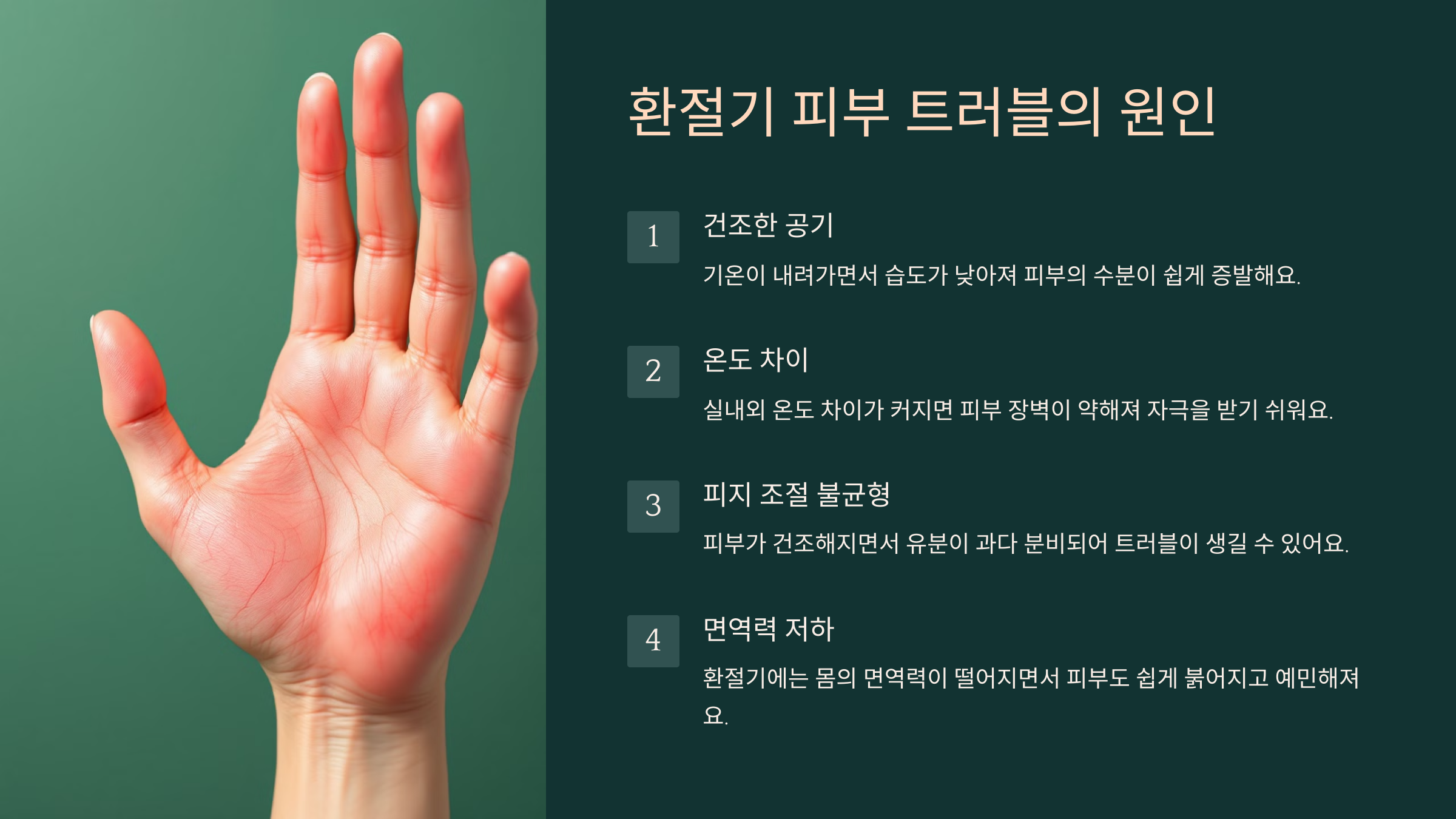 • 🌡 온도 차이: 실내외 온도 차이가 커지면 피부 장벽이 약해져 자극을 받기 쉬워요.