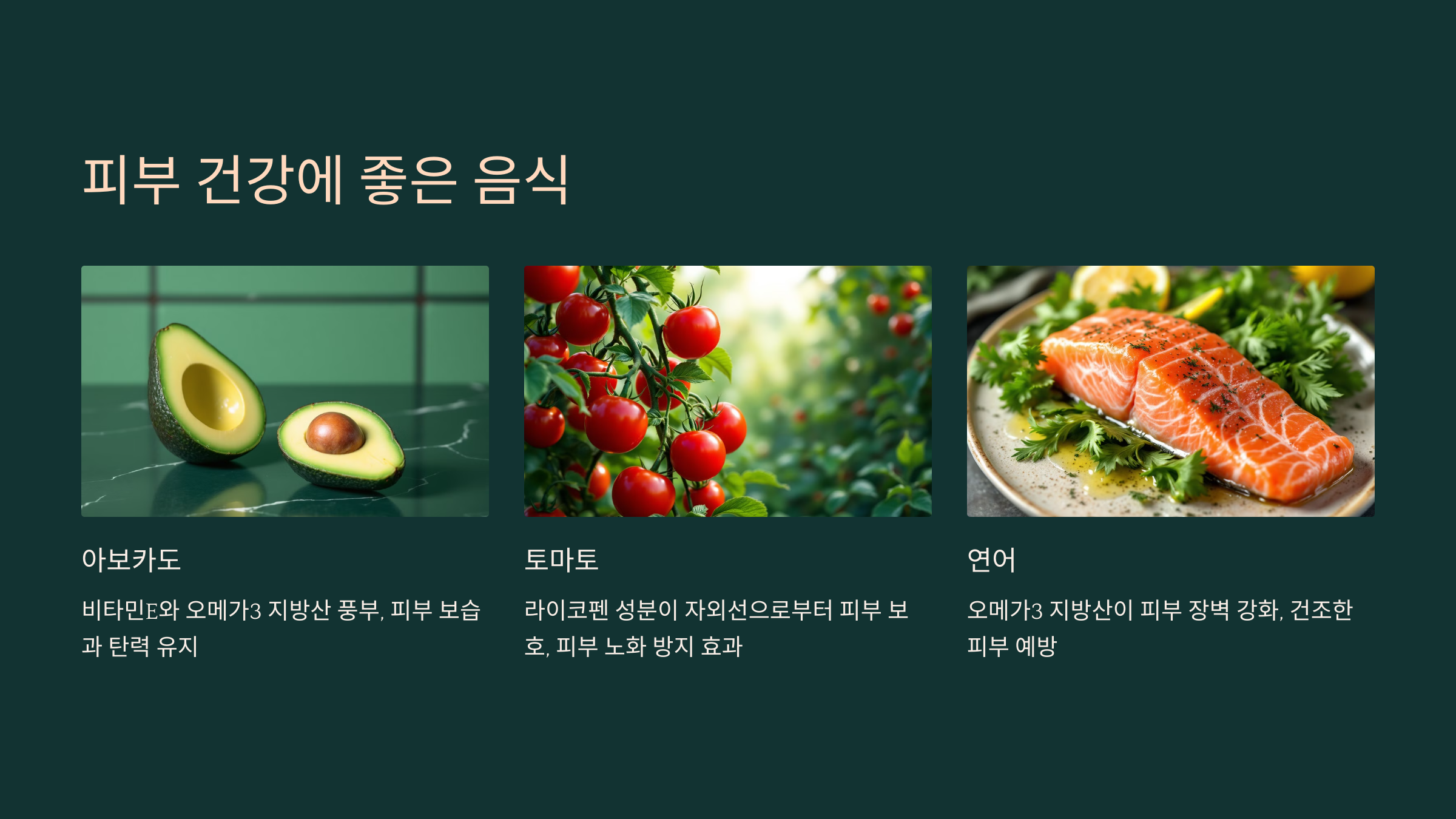 아래 **피부 건강에 좋은 음식**을 참고해서 환절기에도 맑고 촉촉한 피부를 유지하세요! 😊