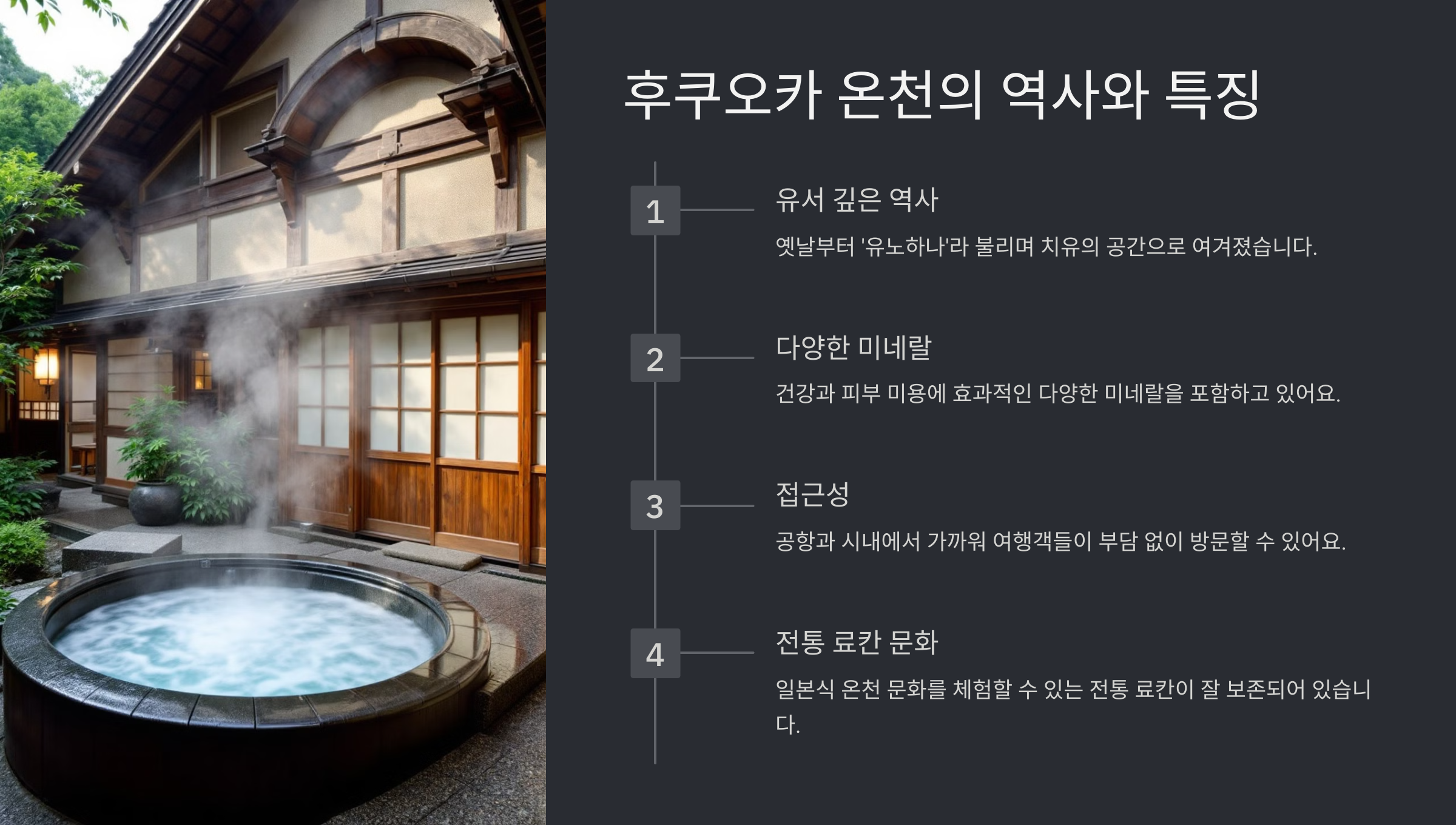 후쿠오카의 온천은 비교적 저렴한 가격에 고품질의 온천수를 즐길 수 있다는 점이 특징이에요. 특히 유황 성분이 풍부한 온천, 미네랄이 가득한 온천 등이 많아 피로 회복과 피부 미용에도 좋아요.