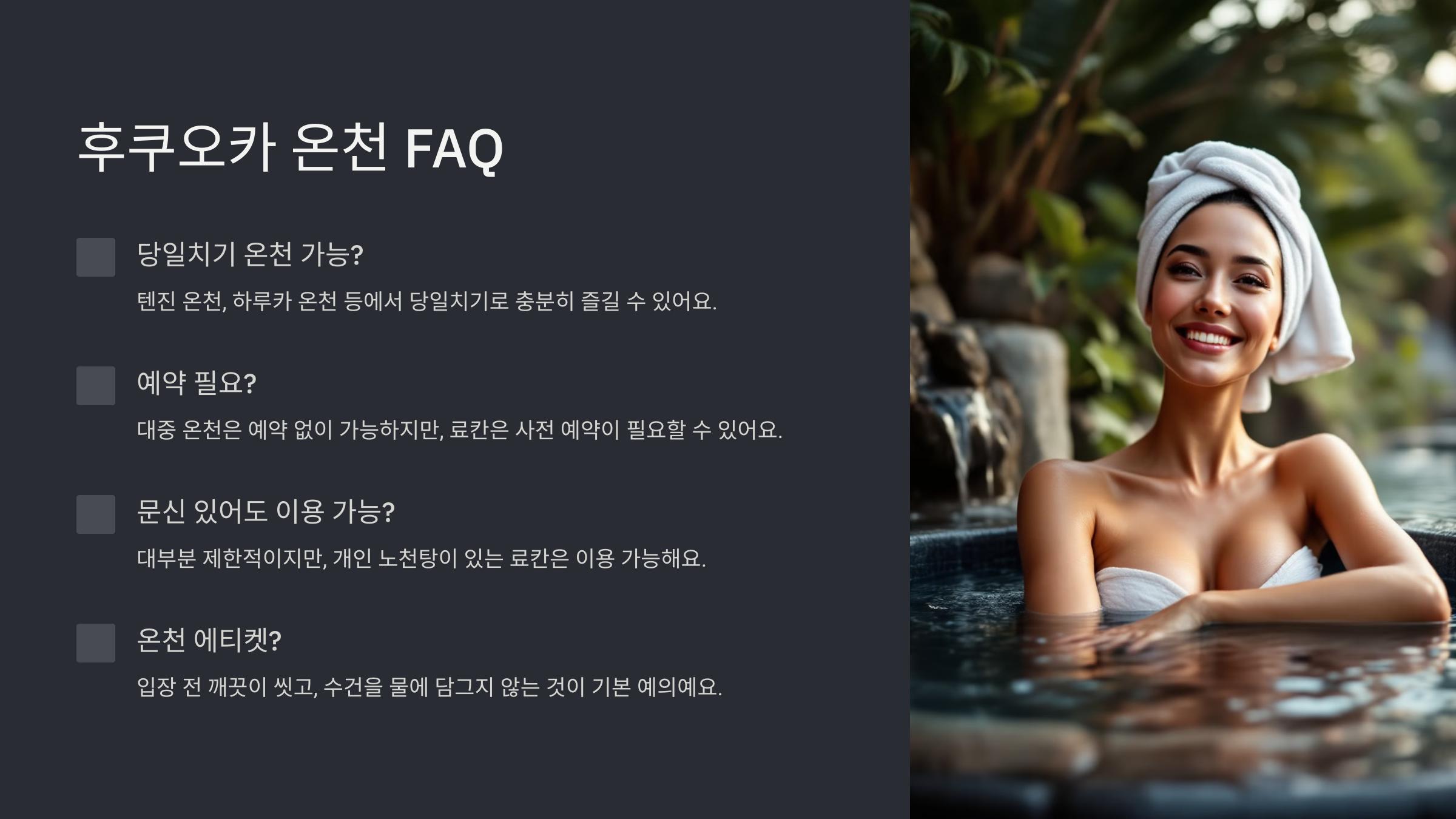 A2. 대중 온천은 보통 예약 없이 입장할 수 있지만, 료칸(여관) 내 온천은 사전 예약이 필요할 수 있어요. 특히 성수기에는 미리 예약하는 걸 추천해요! 📅