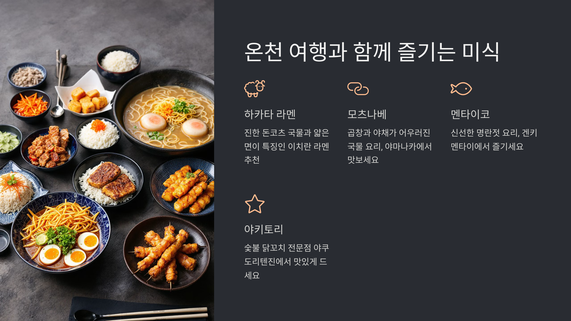 후쿠오카는 온천뿐만 아니라 미식의 천국으로도 유명해요! 온천으로 피로를 푼 후, 맛있는 음식까지 즐기면 여행의 만족도가 더욱 높아지겠죠? 😋🍜