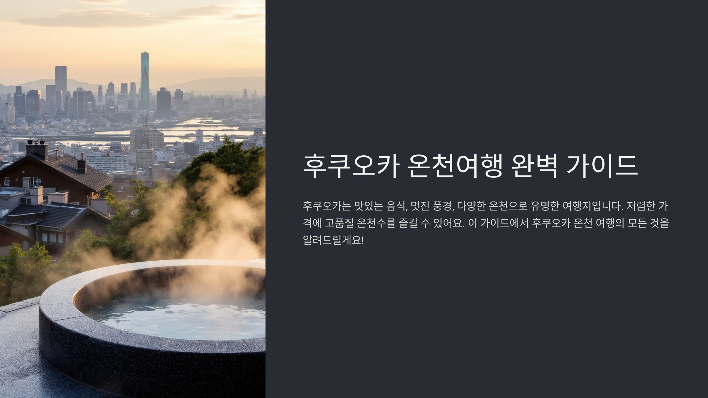 후쿠오카는 일본 규슈 지역의 중심지로, 맛있는 음식과 멋진 풍경, 그리고 다양한 온천으로 유명한 여행지예요. 후쿠오카 시내에는 대형 온천 시설이 많고, 근교로 조금만 나가면 일본 특유의 전통 료칸에서 온천을 즐길 수도 있어요.
