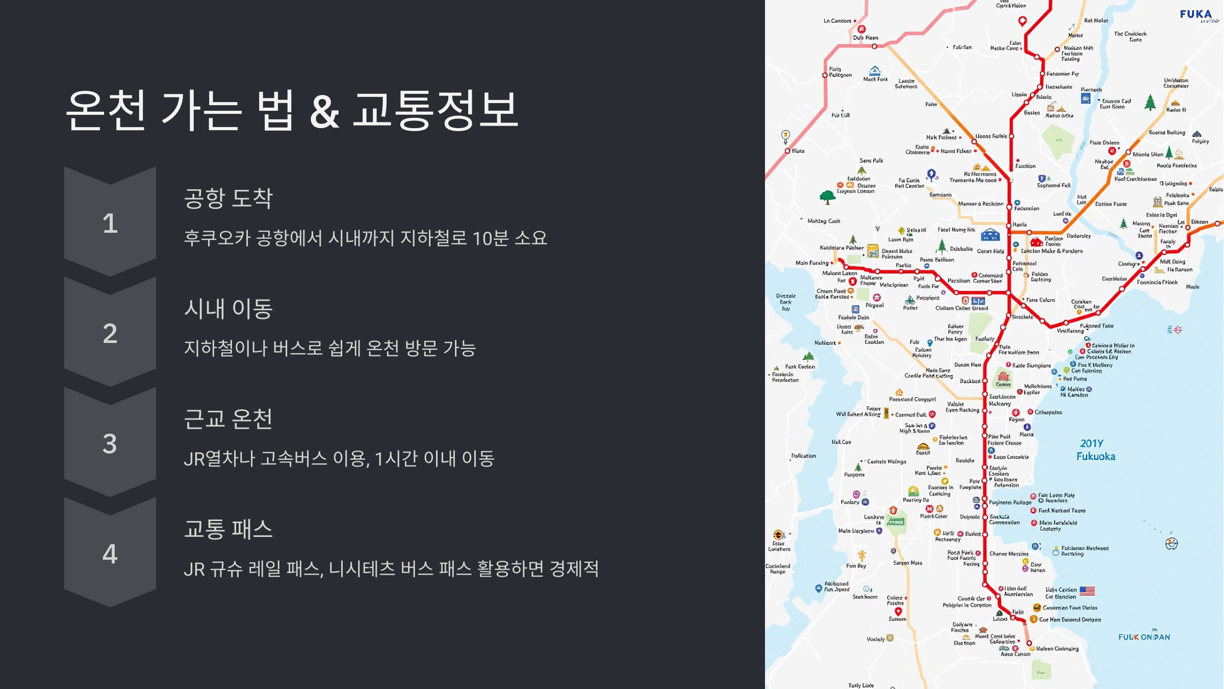 특히 후쿠오카 공항과 하카타역이 가까운 덕분에, 비행기를 타고 도착하자마자 바로 온천으로 이동하는 것도 가능해요! 공항에서 시내까지는 지하철로 10분, 주요 온천까지는 1시간 이내로 이동할 수 있어서 여행자들에게 최적의 환경을 제공하고 있어요. ✈️♨️