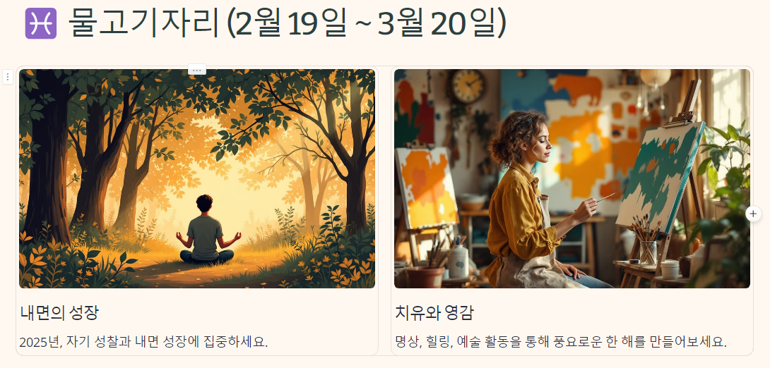 물고기자리에게 2025년은 자기 자신을 돌아보고 내면의 성장을 이루는 해가 될 것입니다. 명상, 힐링, 예술적 활동에 집중하면 더욱 풍요로운 한 해를 보낼 수 있습니다.