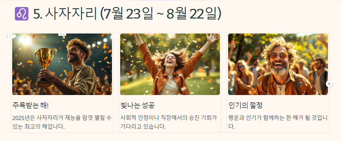2025년은 사자자리가 자신을 빛낼 수 있는 최고의 해입니다. 특히, 사회적 인정이나 직장에서의 승진 기회가 예상됩니다. 자신감을 가지고 나아가세요! 🎉