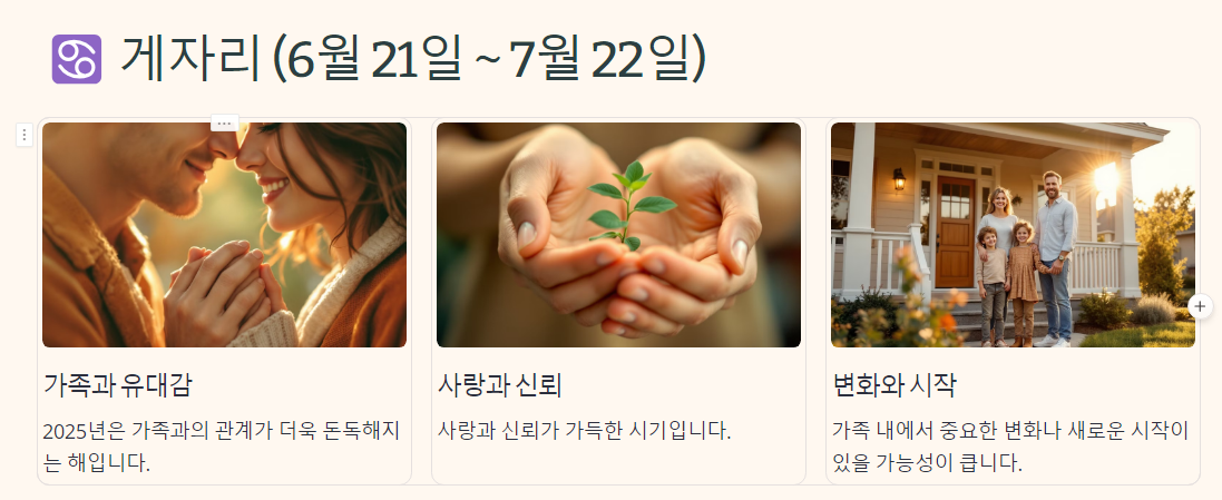 게자리에게 2025년은 가족과의 관계가 더욱 돈독해지는 해입니다. 사랑과 신뢰가 가득한 시기로, 특히 가족 내에서 중요한 변화나 새로운 시작이 있을 가능성이 큽니다.