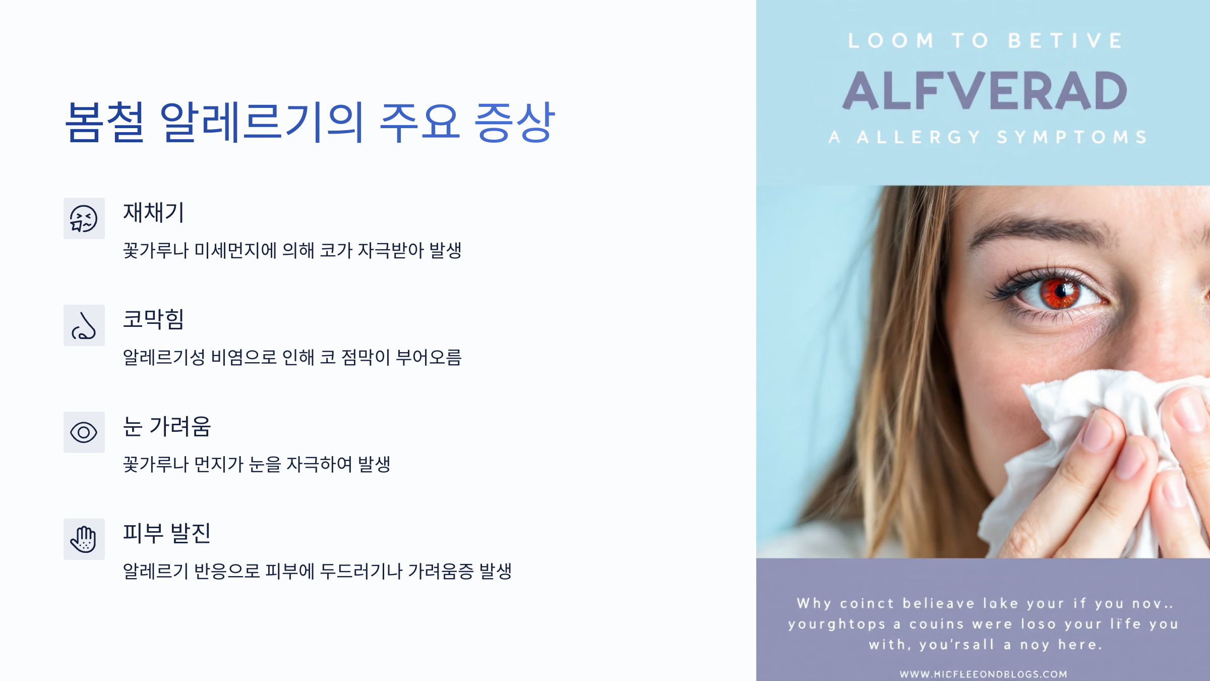 봄이 오면 꽃이 피고 날씨가 따뜻해져서 기분이 좋아지지만, 알레르기 환자들에게는 힘든 계절이 될 수 있어요. 😷 재채기, 코막힘, 눈 가려움증 등의 증상이 나타나는 분들 많죠?