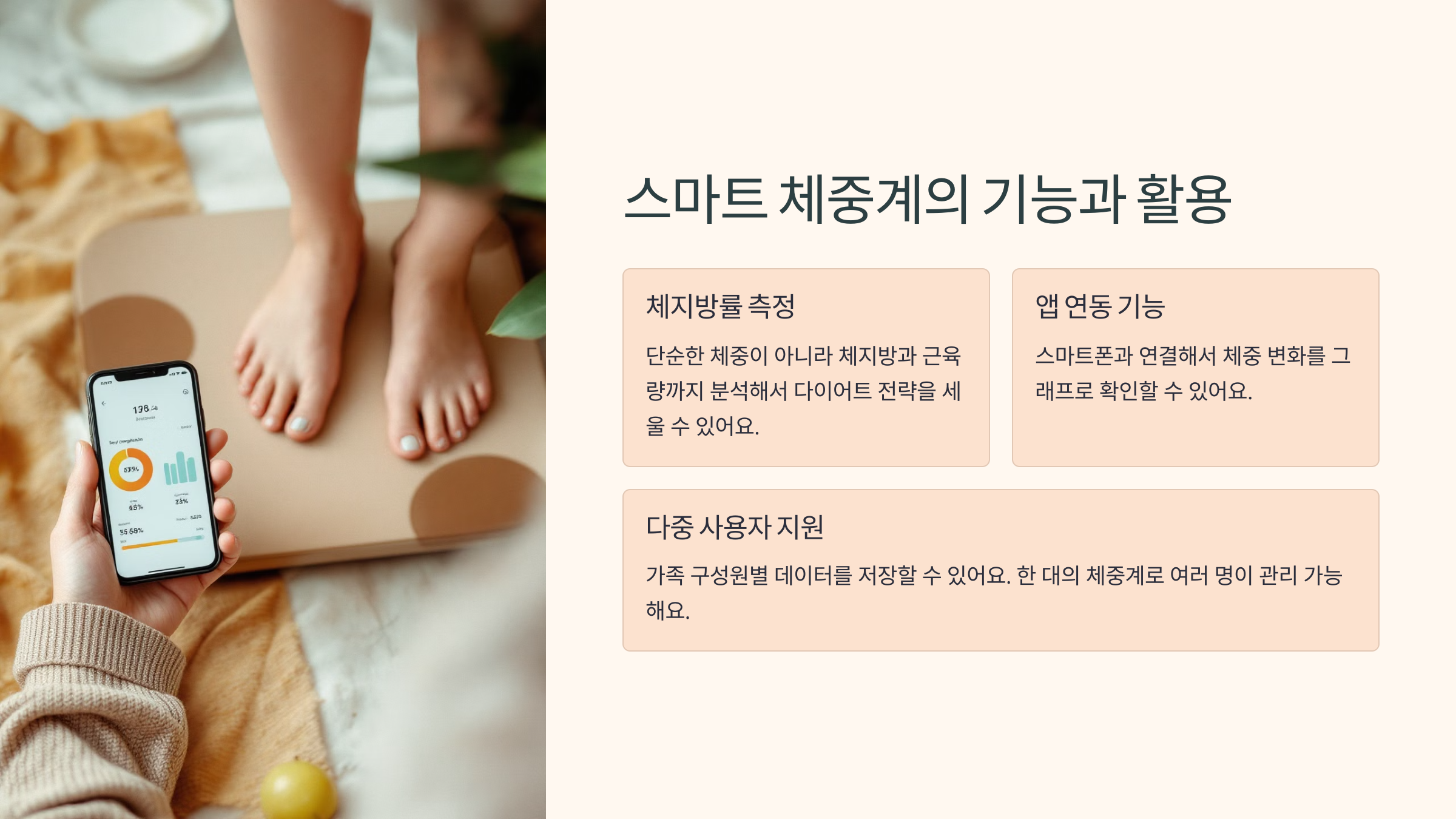 최근에는 스마트 체중계가 인기를 끌고 있어요. 체중뿐만 아니라 체지방률, 근육량, 수분량까지 분석해 건강 관리를 돕는 기능이 추가되었답니다. 📱