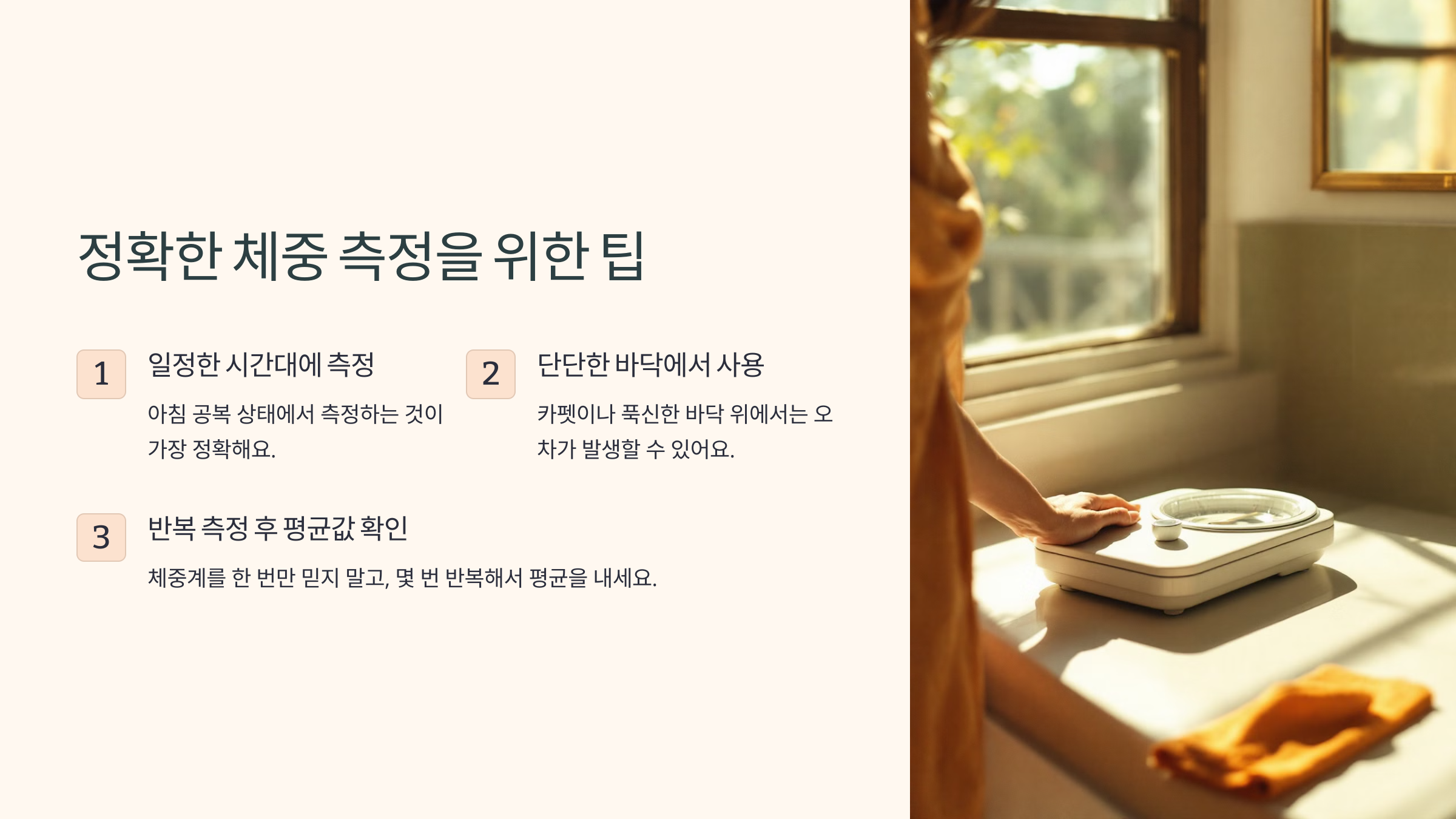 체중을 측정할 때마다 값이 다르게 나와서 헷갈린 적 있나요? 정확한 측정을 위해 아래 팁을 참고해 보세요! 🤓