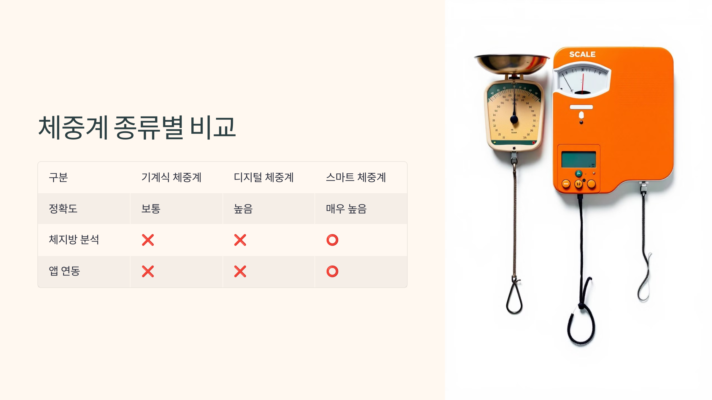 디지털 체중계: 전자 센서를 이용해 체중을 정확하게 측정할 수 있어요. 숫자로 표시되기 때문에 가독성이 뛰어나죠. 📊
