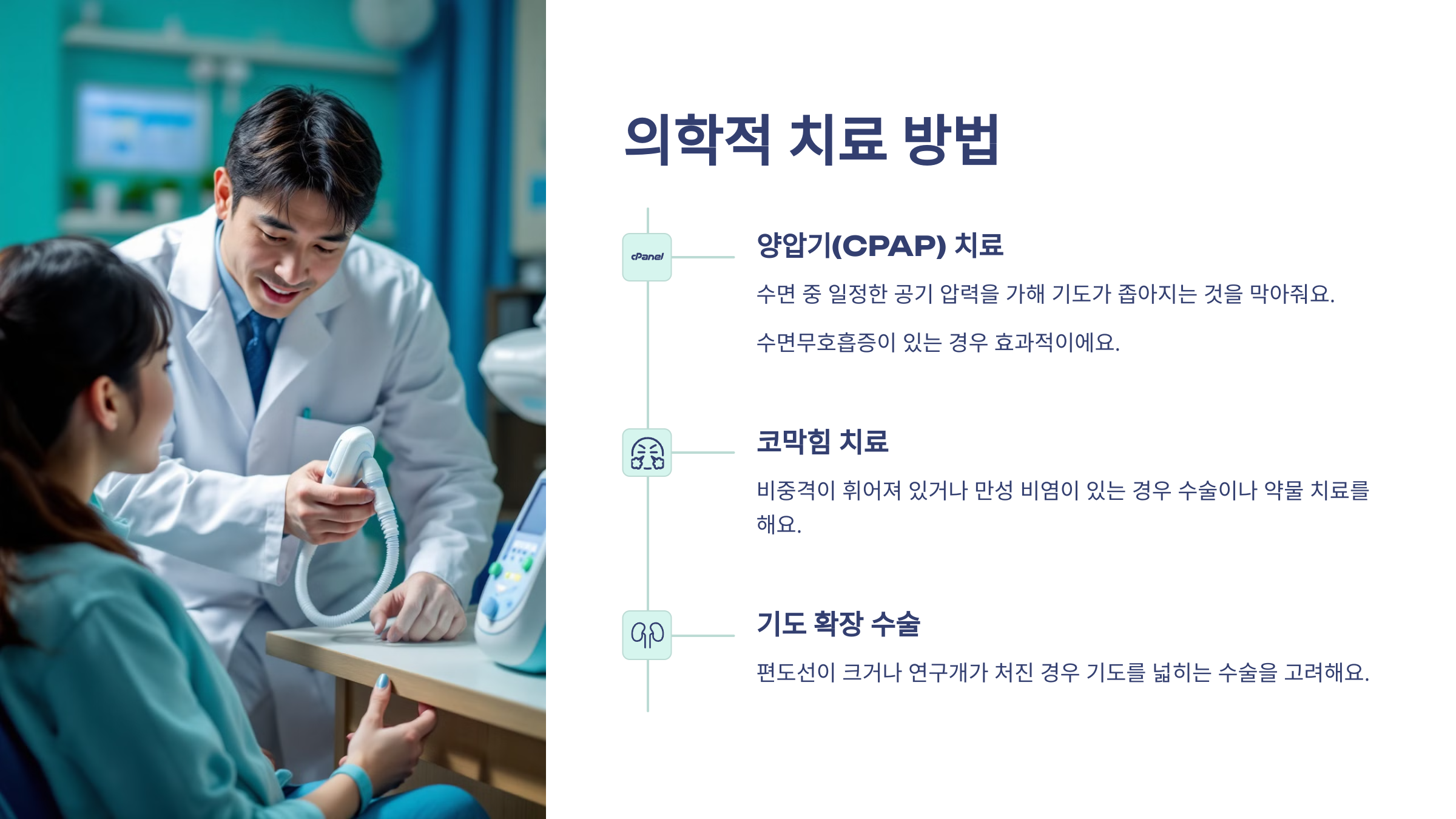 코골이가 심하거나 수면무호흡증이 동반되는 경우, 생활 습관 개선이나 보조 기구만으로 해결하기 어려울 수 있어요. 이럴 때는 병원을 방문해 정확한 진단을 받고 치료를 받는 것이 좋아요. 🩺