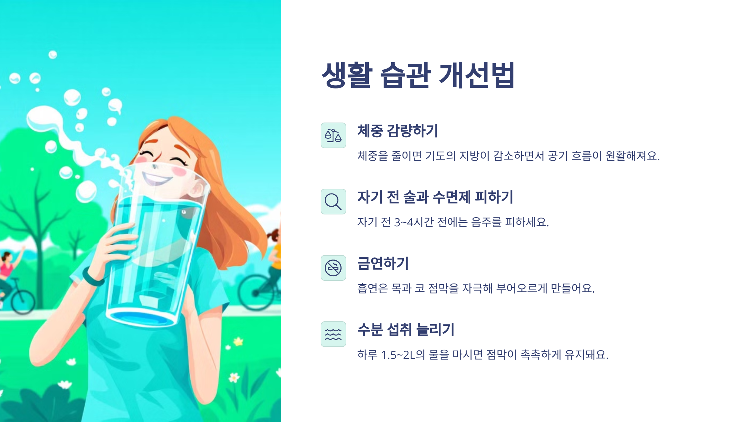 몸이 건조하면 기도 점막이 끈적해지면서 코골이를 유발할 수 있어요. 하루 1.5~2L의 물을 충분히 마시면 점막이 촉촉하게 유지돼서 기도가 원활하게 열려요. 💧