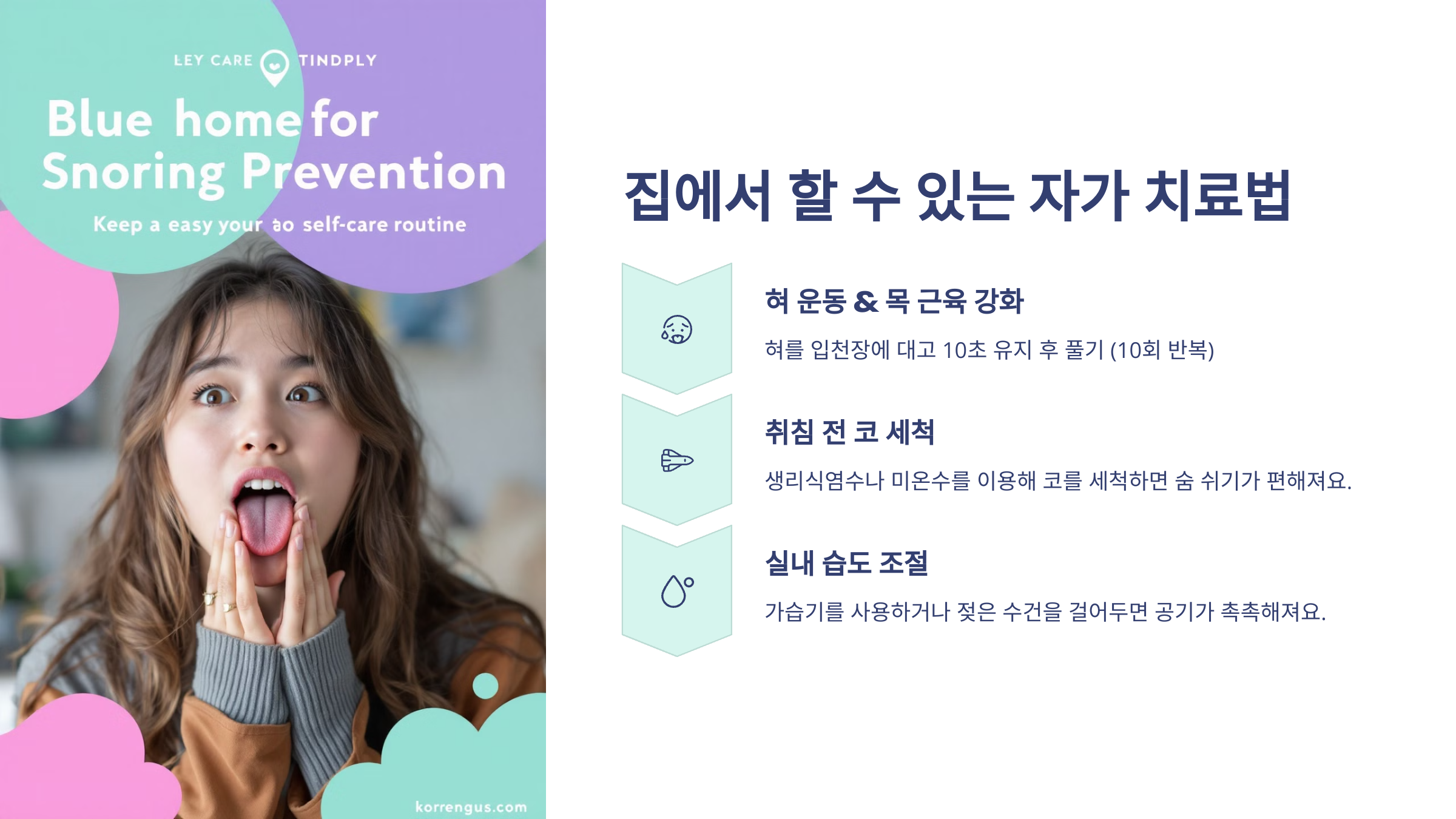 혀와 목 근육이 약해지면 기도가 쉽게 막혀 코골이가 심해질 수 있어요. 하루 5~10분만 투자해서 간단한 운동을 해보세요! 💪
