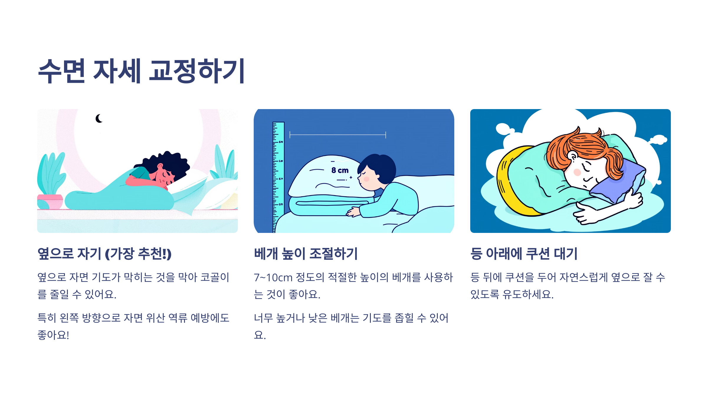 코골이는 잘못된 수면 자세 때문에 더 심해질 수 있어요. 특히 똑바로 누워 자는 자세는 기도가 막혀 코골이를 유발할 수 있기 때문에 자세를 바꾸는 것만으로도 큰 효과를 볼 수 있어요! 🛏️