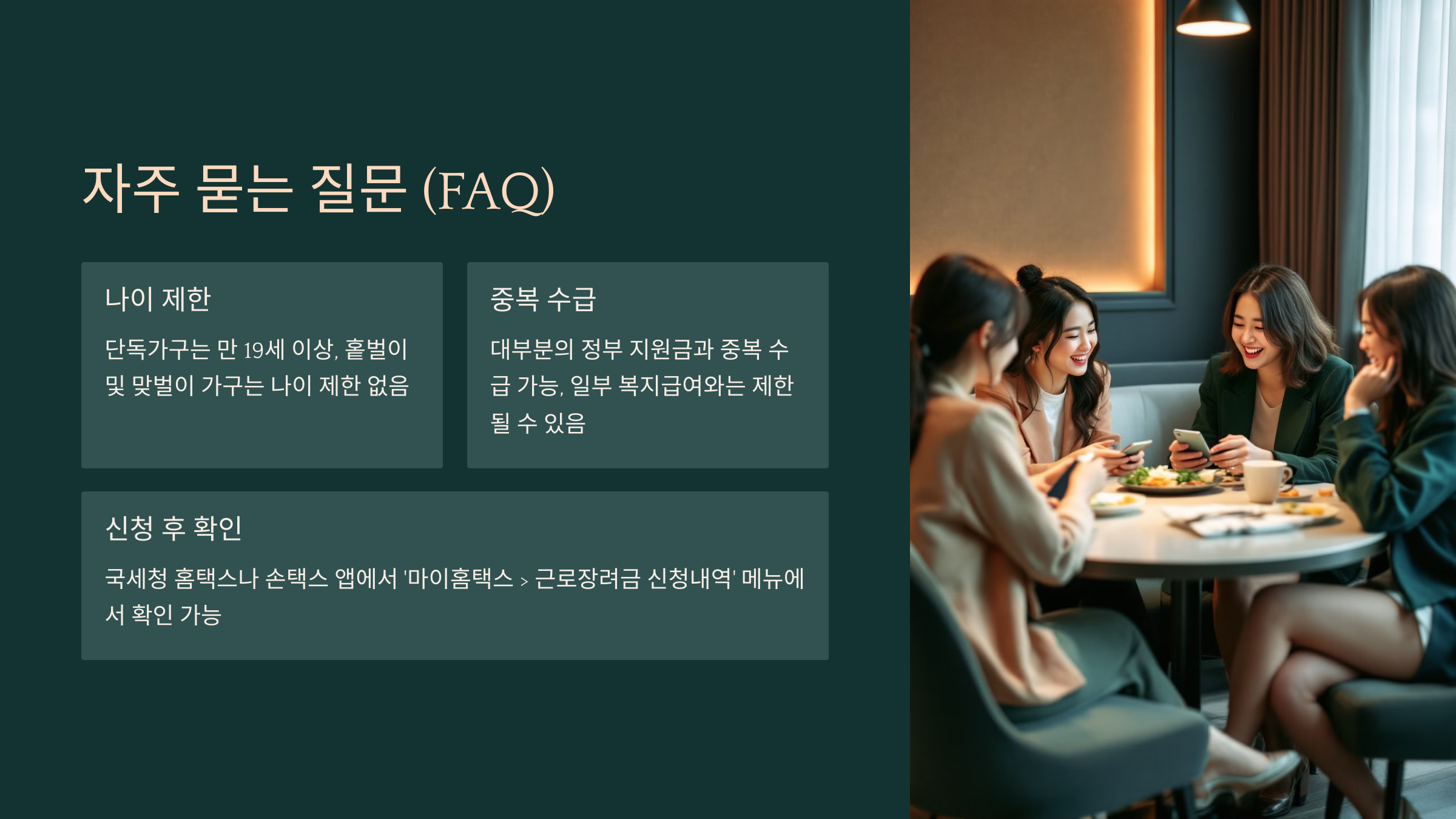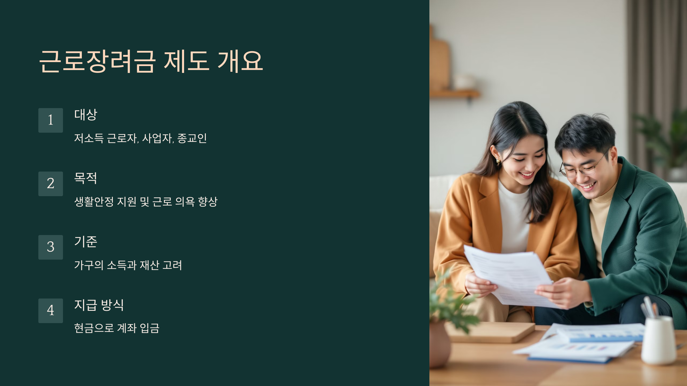 이 제도는 가구의 유형(단독가구, 홑벌이가구, 맞벌이가구)에 따라 지급 금액이 다르고, 근로소득뿐만 아니라 사업소득과 종교소득도 포함돼요. 한 번 신청하면 정해진 지급일에 계좌로 입금돼요. 자동신청 대상자는 별도의 절차 없이 안내문을 통해 신청할 수 있어요.