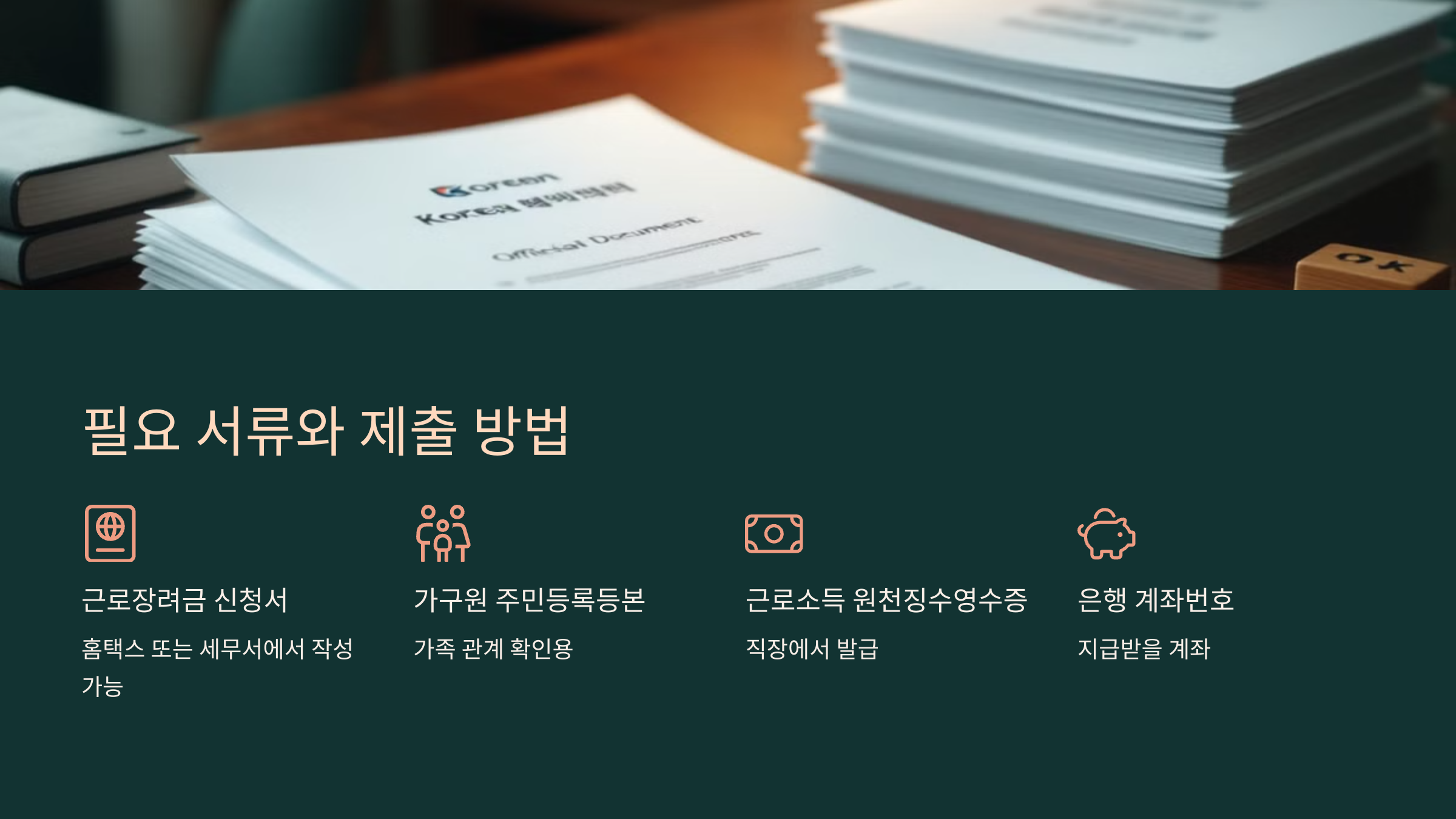 근로장려금 신청 시 다음 서류들을 준비하세요. 일부는 국세청에서 자동으로 확인하지만, 상황에 따라 추가 제출이 필요할 수 있어요.