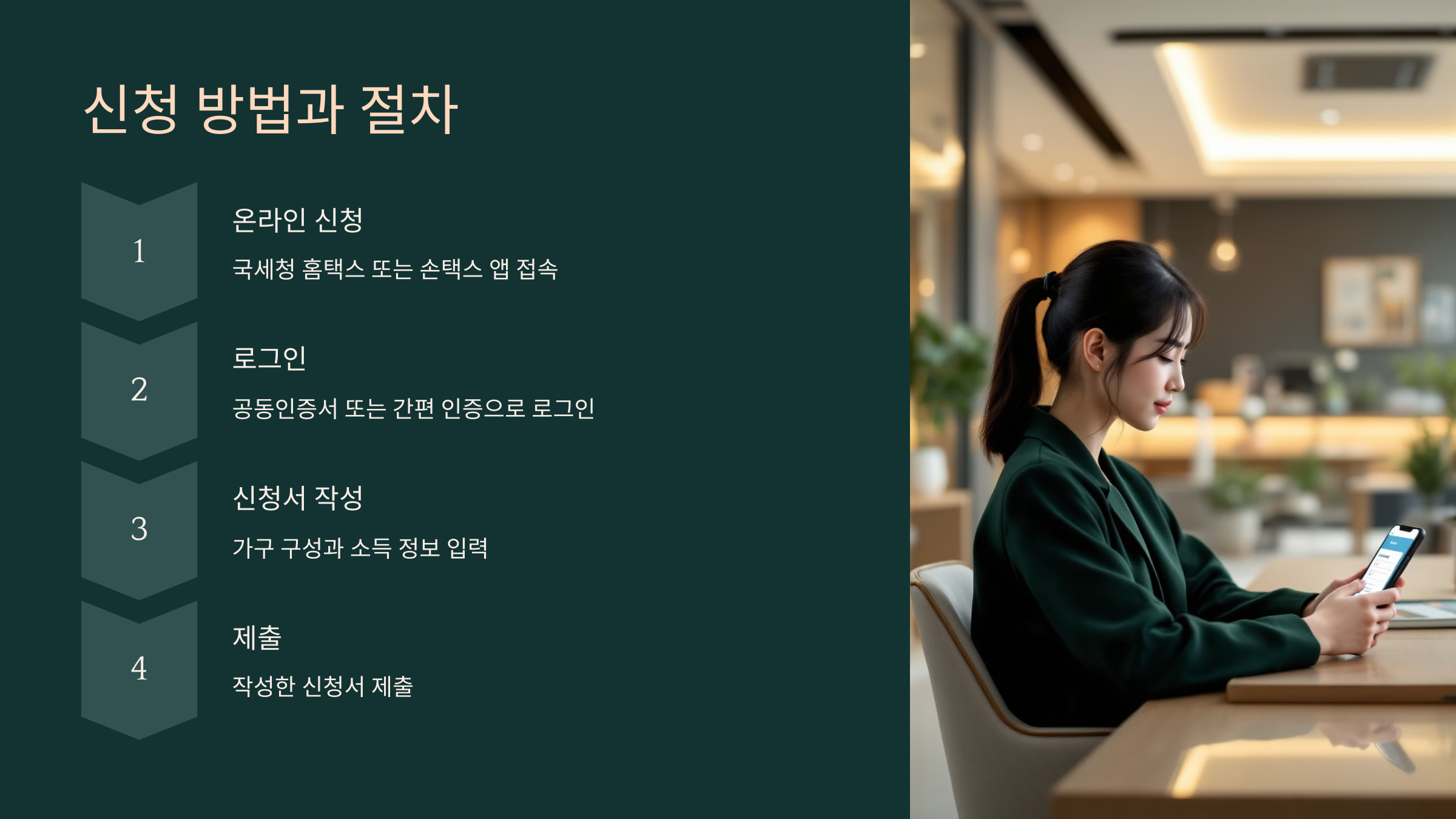 근로장려금은 온라인과 오프라인 모두 신청할 수 있어요. 아래 절차에 따라 간단히 신청해보세요.