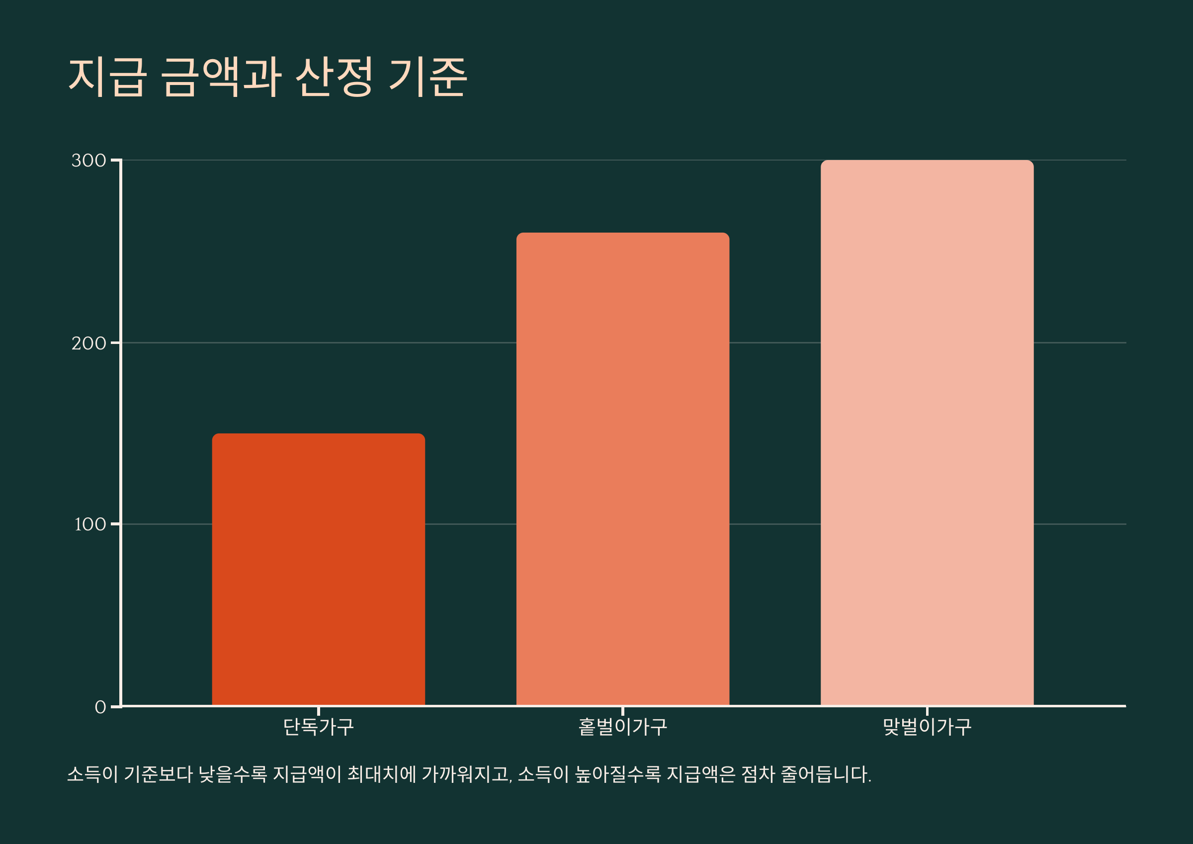 💡 소득이 기준보다 낮을수록 지급액이 최대치에 가까워지고, 소득이 높아질수록 지급액은 점차 줄어들어요.