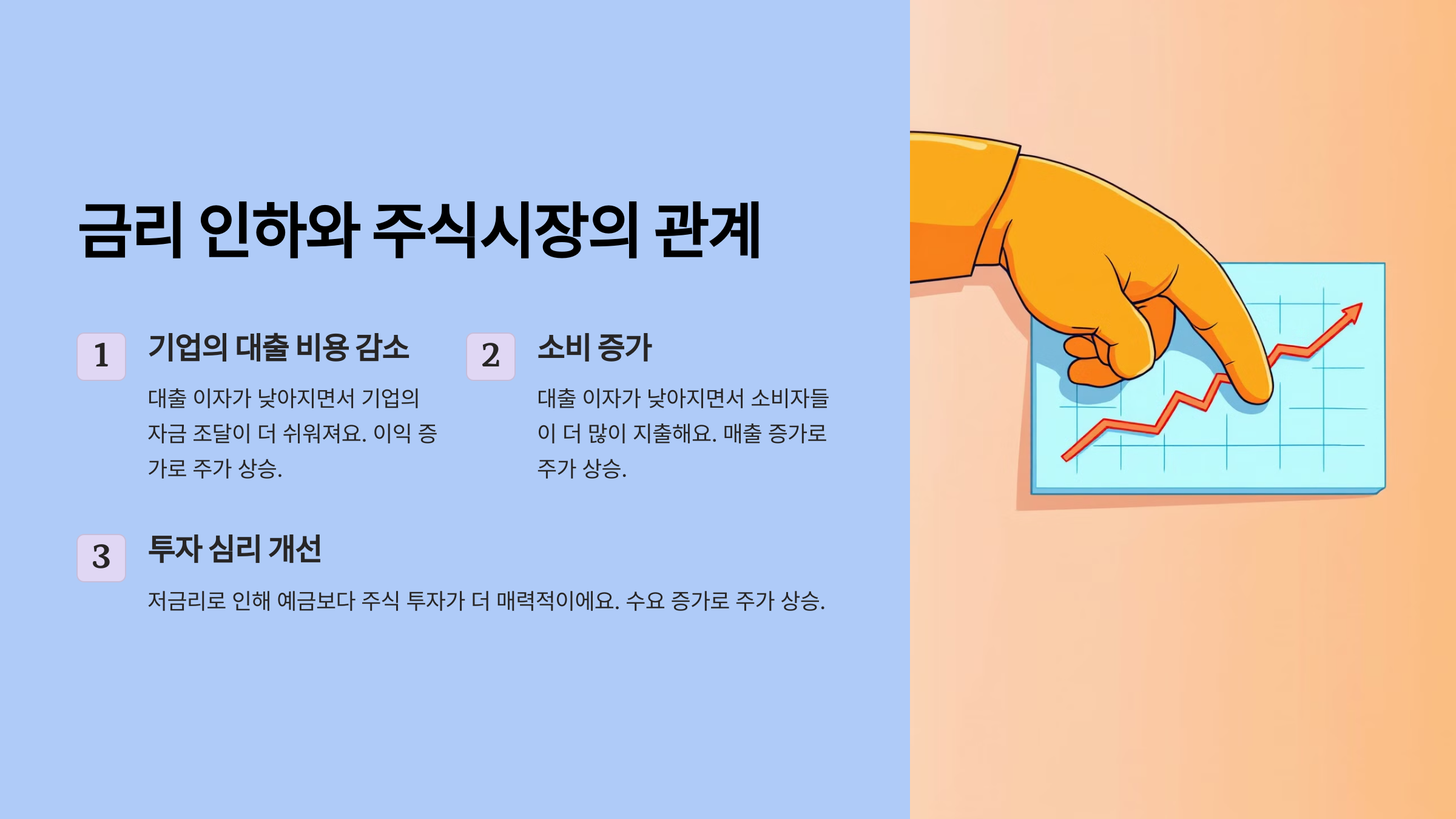 기업의 대출 비용 감소 | 대출 이자가 낮아지면서 기업의 자금 조달이 더 쉬워져요. | 이익 증가 → 주가 상승 |