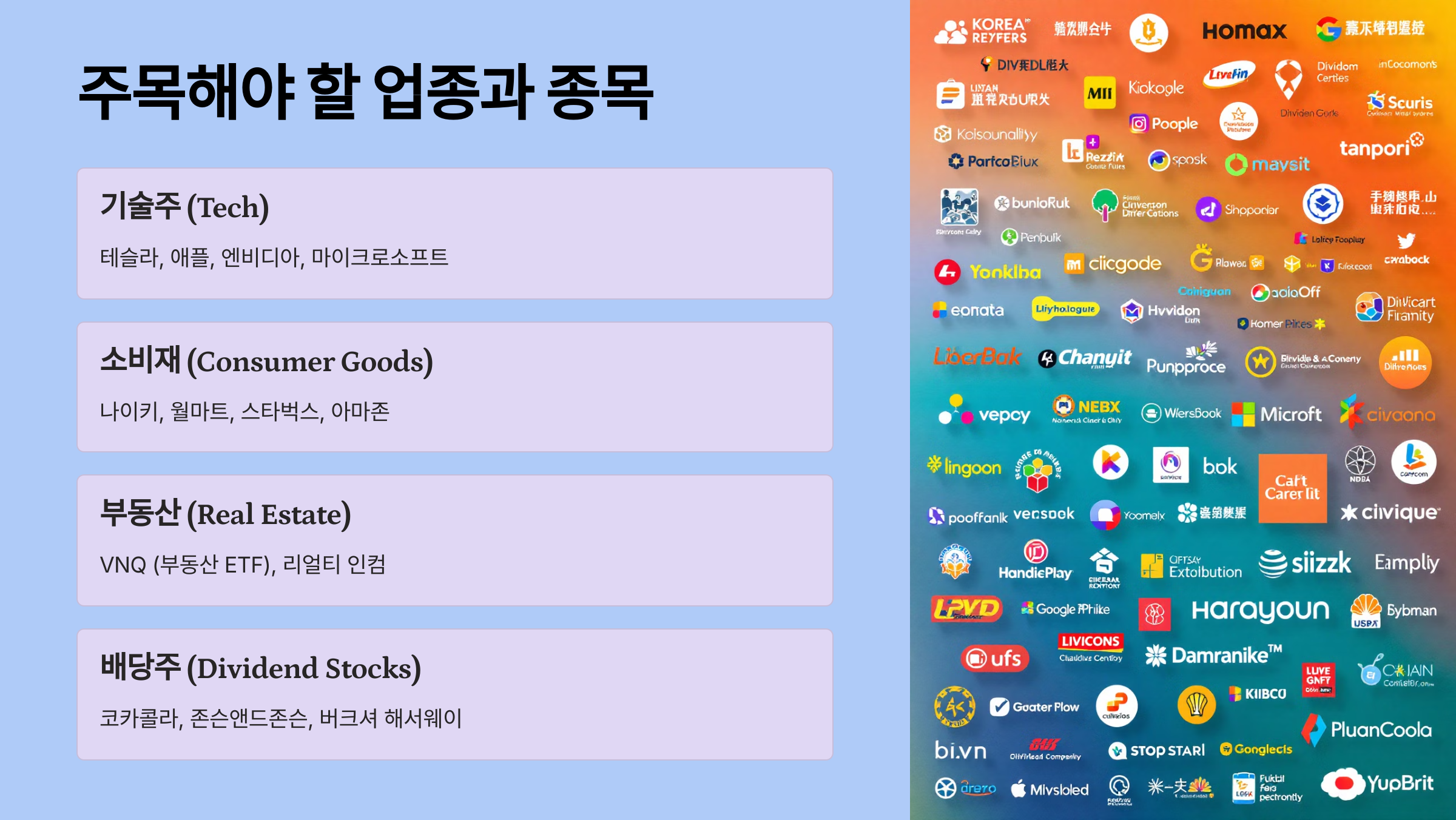 - 포트폴리오를 다변화하세요: **기술주, 소비재, 배당주**를 적절히 배분해 **리스크를 최소화**하세요.