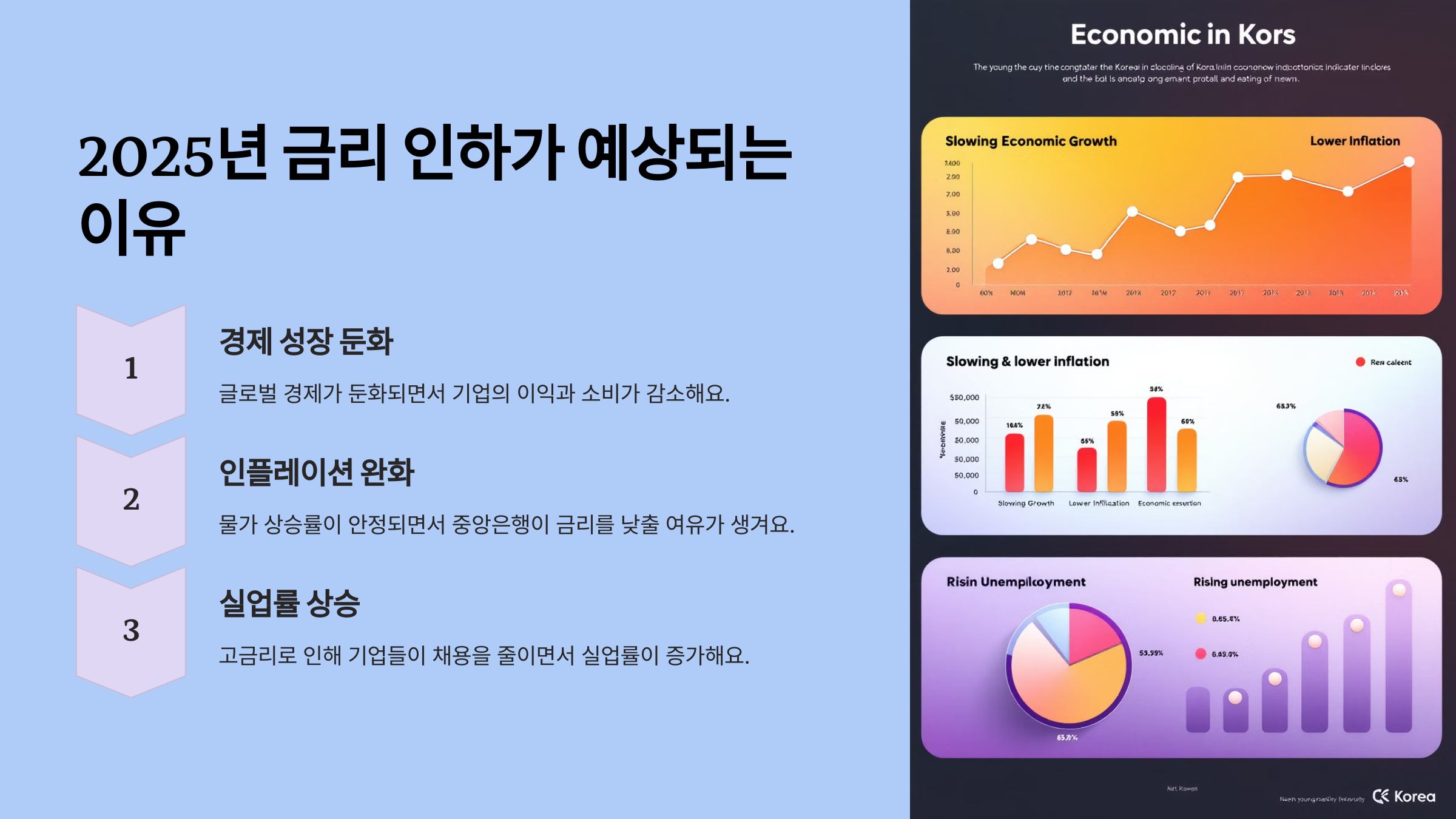 경제 성장 둔화 | 글로벌 경제가 둔화되면서 기업의 이익과 소비가 감소해요. | 금리 인하로 소비와 투자를 촉진 |