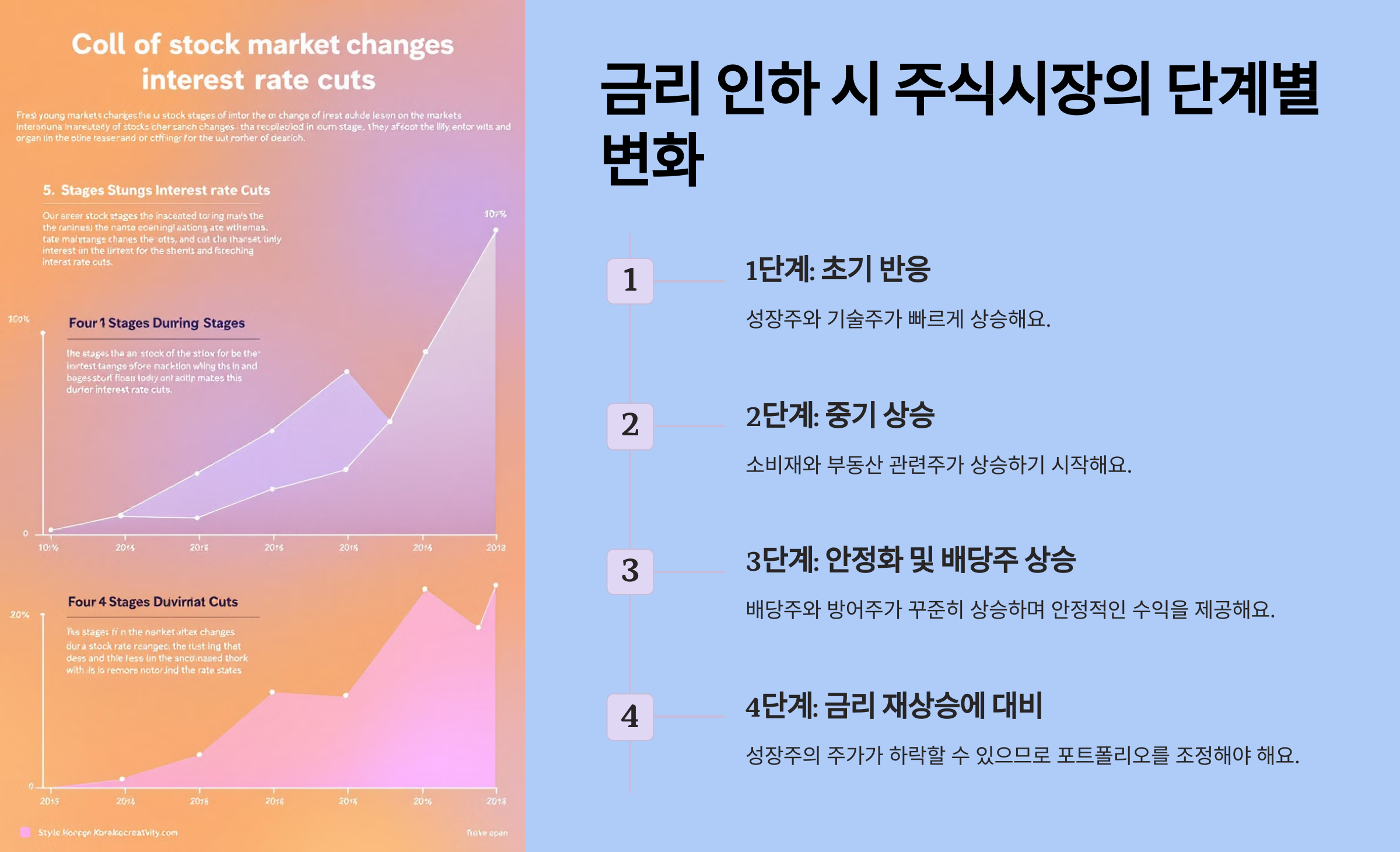 - 4단계에서는 리스크를 최소화하세요: 금리가 다시 오를 조짐이 보이면 **성장주의 비중을 줄이고**, **ETF와 배당주**로 **안정성을 확보**하세요.