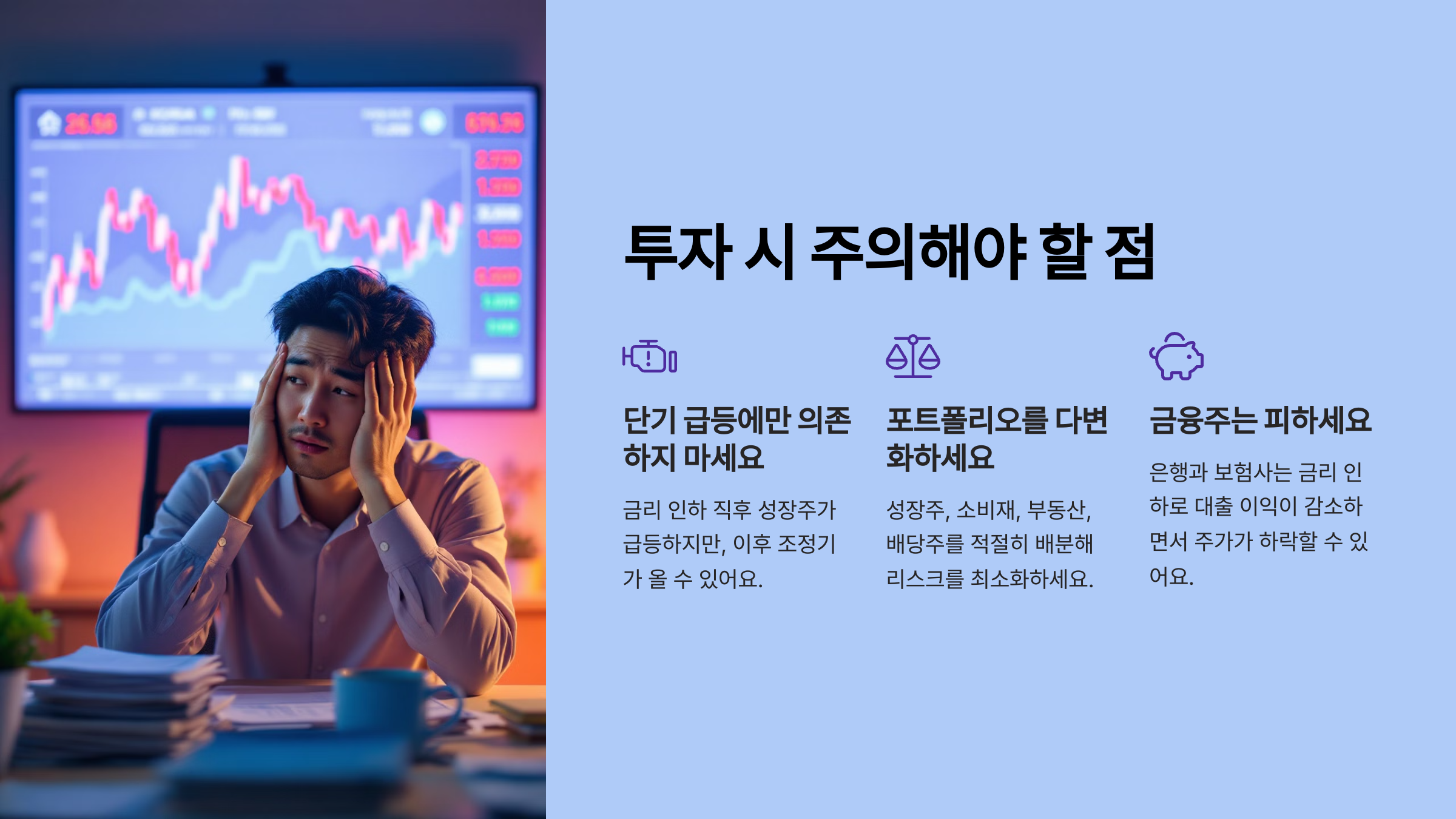금융주는 피하세요 | **은행과 보험사**는 금리 인하로 **대출 이익이 감소**하면서 주가가 하락할 수 있어요. | 금융주는 최소화하고 **소비재, 부동산, 기술주**에 집중하세요. |