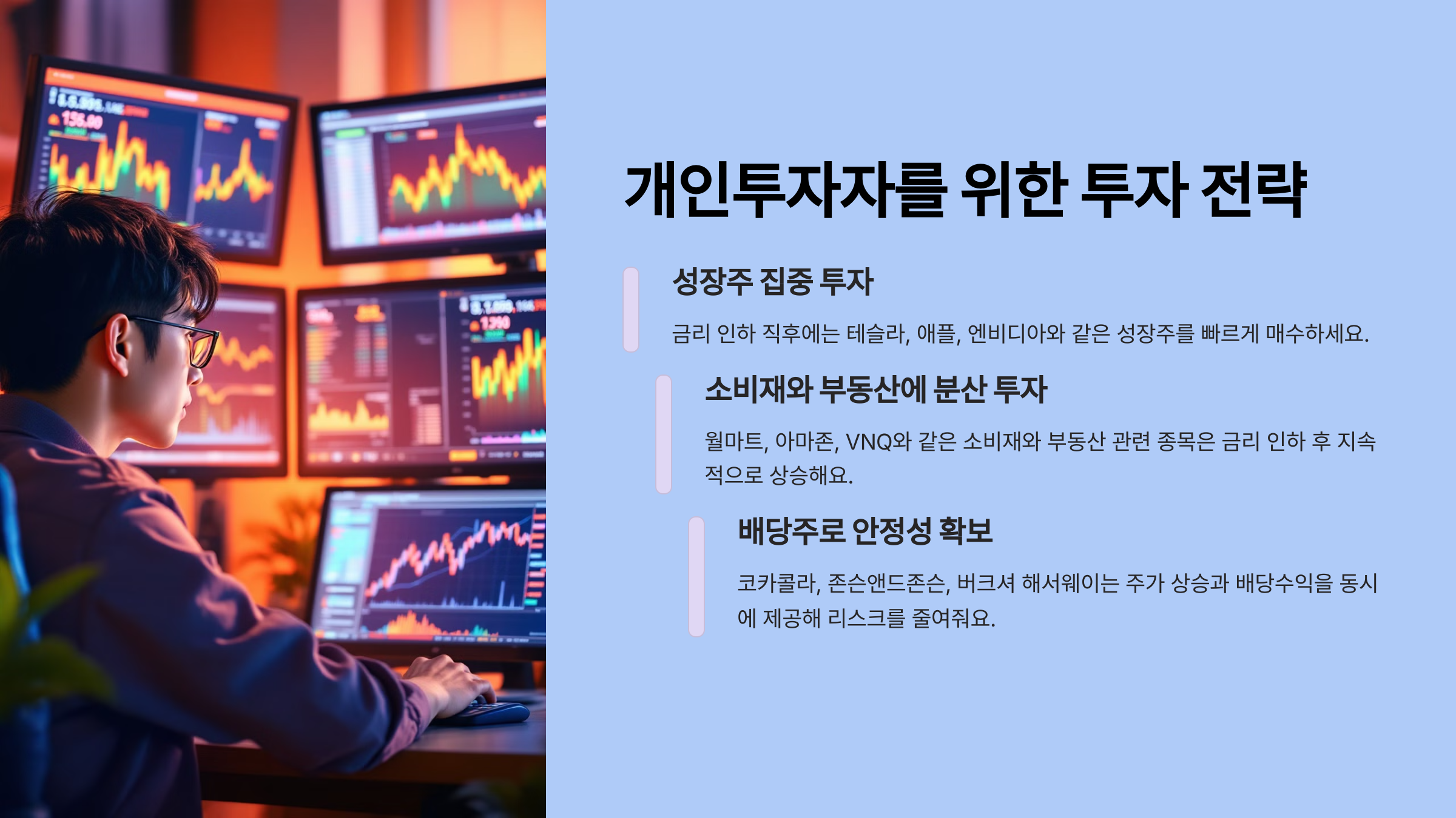 - 배당주는 상대적으로 안정적: **배당주**는 금리 인하 시 더 매력적으로 보이지만, **성장주만큼 빠르게 오르지는 않아요.**