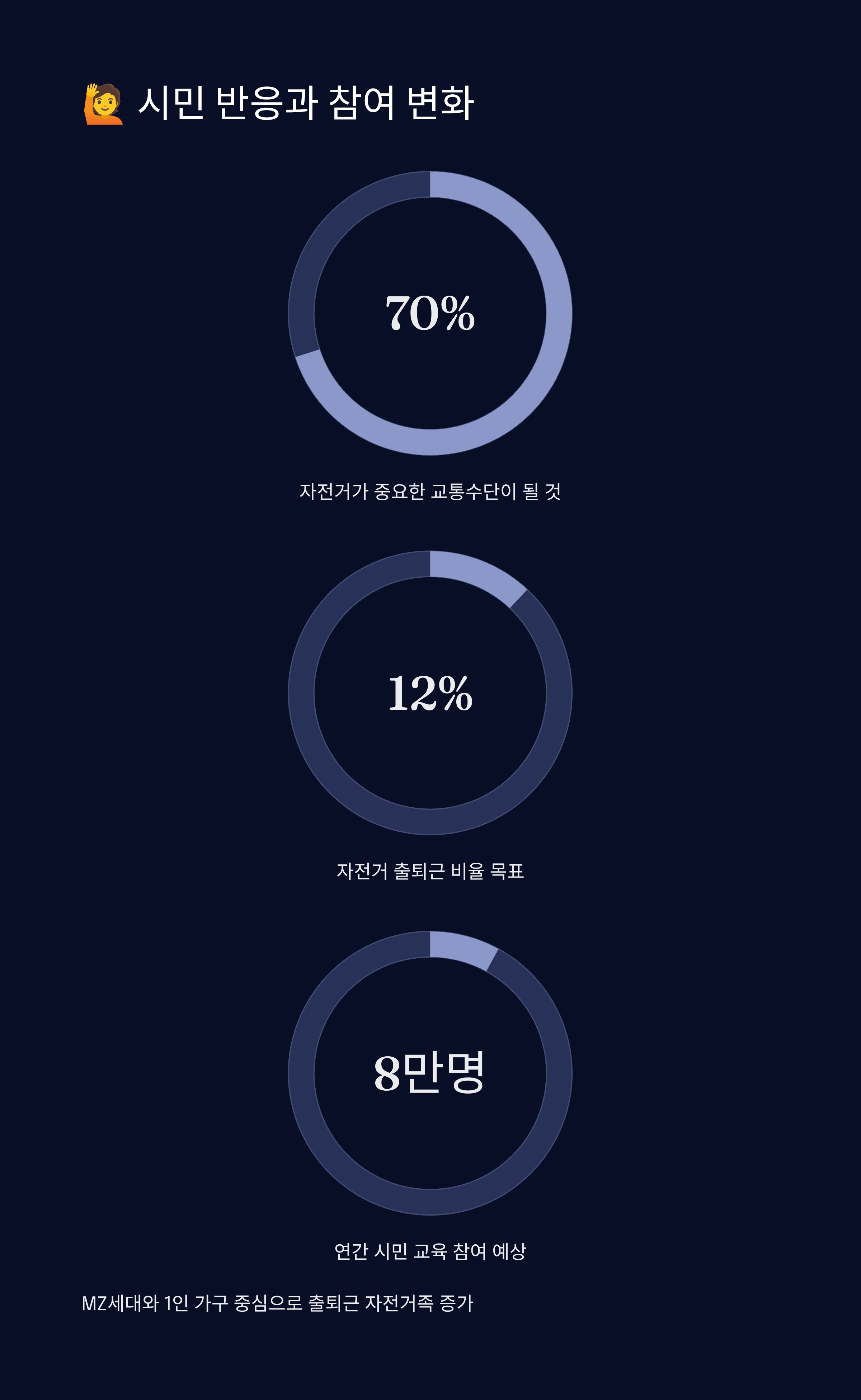 서울시의 자전거 정책 변화가 현실로 다가오면서, 시민들의 반응도 점점 뚜렷하게 나타나고 있어요. 많은 시민들이 새로운 인프라와 정책 변화에 기대를 걸고 있고, 자전거 이용 의향도 함께 증가하고 있어요. 특히 MZ세대와 1인 가구를 중심으로 ‘출퇴근 자전거족’이 늘어나고 있다는 게 흥미롭죠.