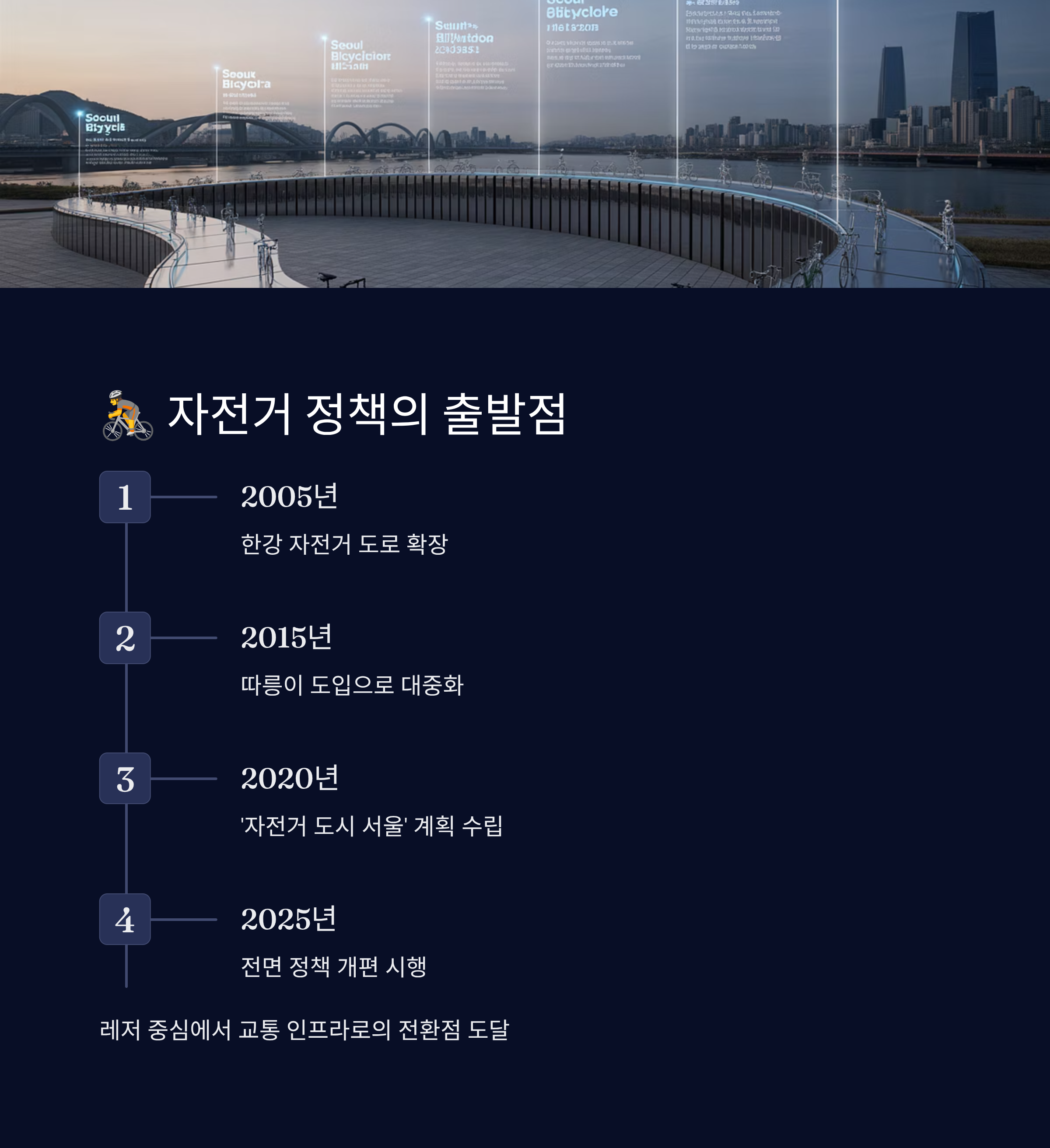 서울시의 자전거 정책은 사실 어제오늘 생긴 것이 아니에요. 최초로 '자전거 전용도로'라는 개념이 등장한 건 2000년대 초반이에요. 당시에는 한강 자전거 도로 정도가 대표적인 인프라였죠. 이후 도심으로 자전거 정책이 확장되기 시작하면서 공공자전거 따릉이의 등장(2015년)으로 대중성에 불을 붙였답니다.