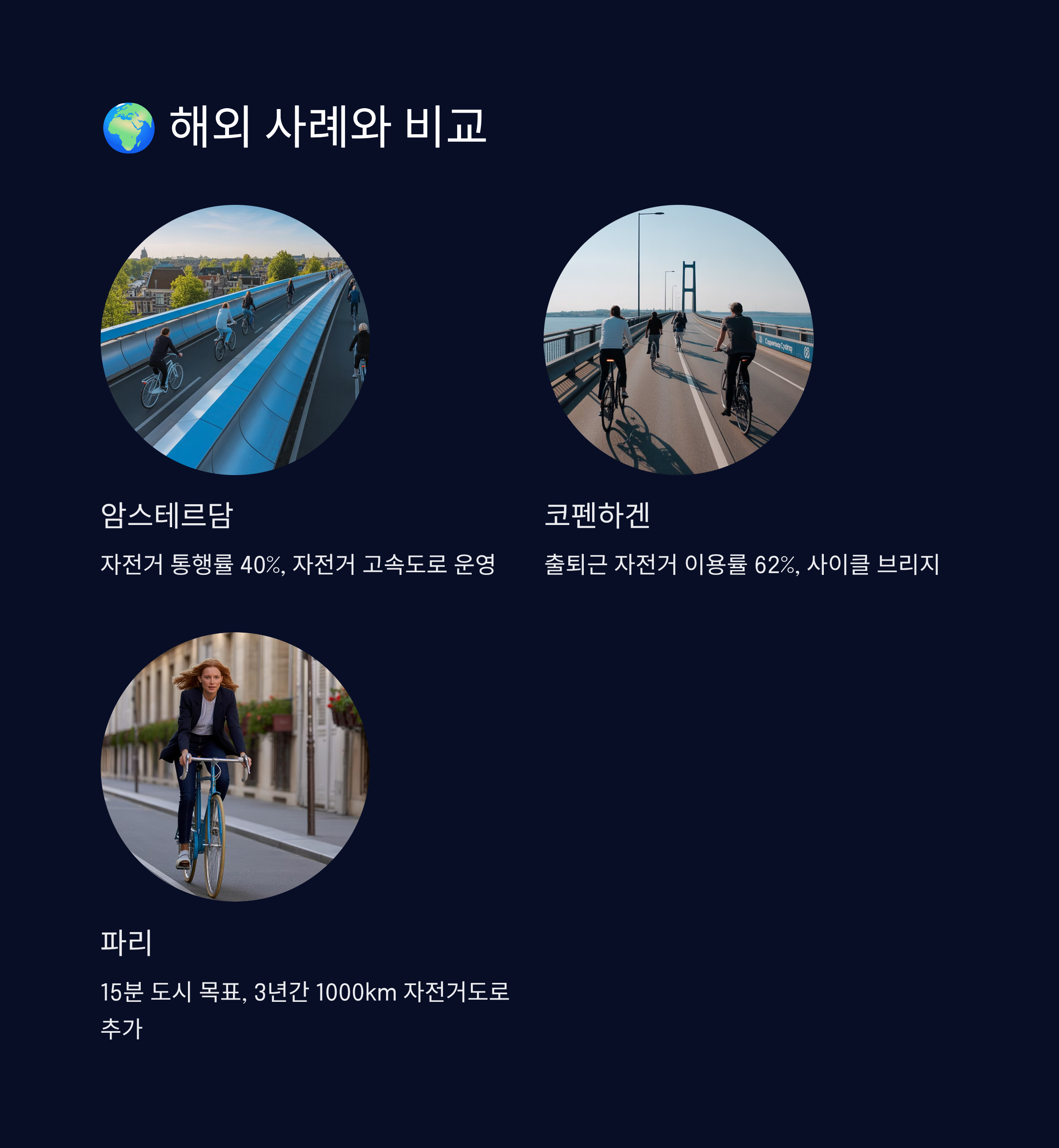 이제 서울의 자전거 정책은 더 이상 '생활체육'이 아니라 '환경·에너지 절약·도시 교통 대안'으로 포지셔닝 되고 있어요. 이런 인식 전환이 바로 정책 변화의 출발점이에요.