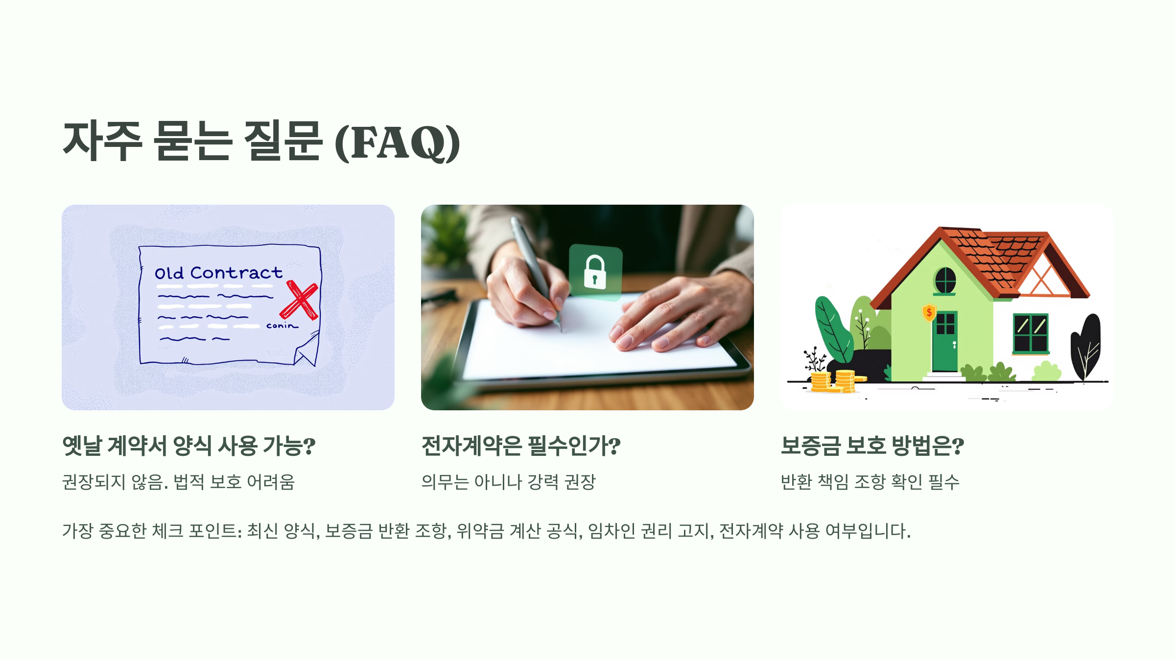 A1. 권장되지 않아요. 최신 양식에는 보증금 보호, 위약금, 권리 고지 등 필수 조항이 포함되어 있기 때문에 구형 양식 사용 시 법적 보호를 받기 어렵고 분쟁 발생 시 불리할 수 있어요.