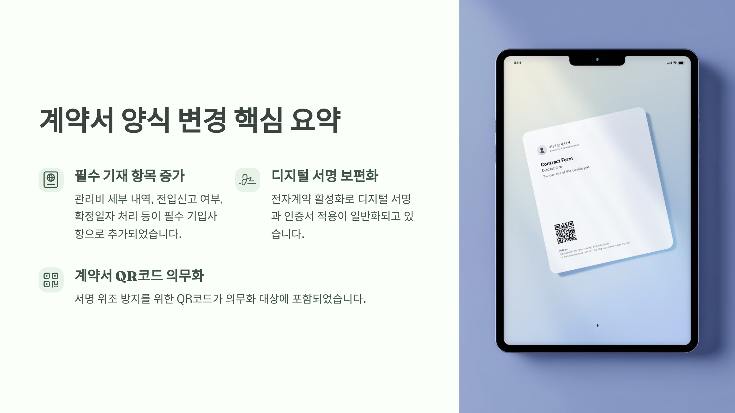 서면 계약 외에도 전자계약 활성화로 인해 디지털 서명과 인증서 적용이 보편화되고 있어요. 서명 위조 방지를 위한 '계약서 QR코드'도 의무화 대상에 포함됐답니다. 과거 양식 그대로 사용하면 안 돼요!