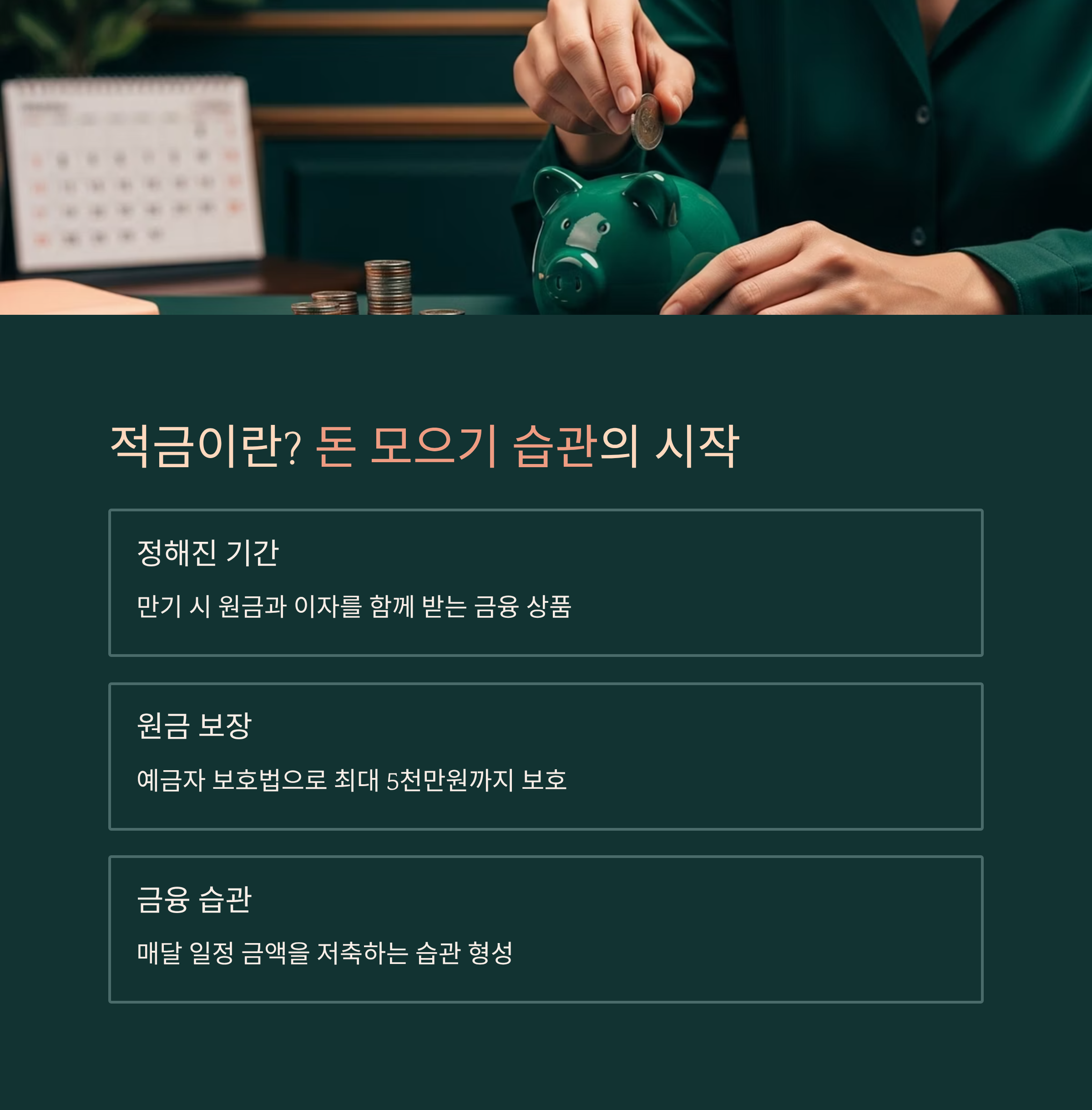 적금의 또 다른 장점은 원금이 보장된다는 점이에요. 예금자 보호법에 따라 최대 5천만 원까지 보호되기 때문에 리스크 없이 안정적으로 돈을 모을 수 있어요. 그래서 사회 초년생이나 재테크 입문자에게 가장 많이 추천되는 상품이죠.
