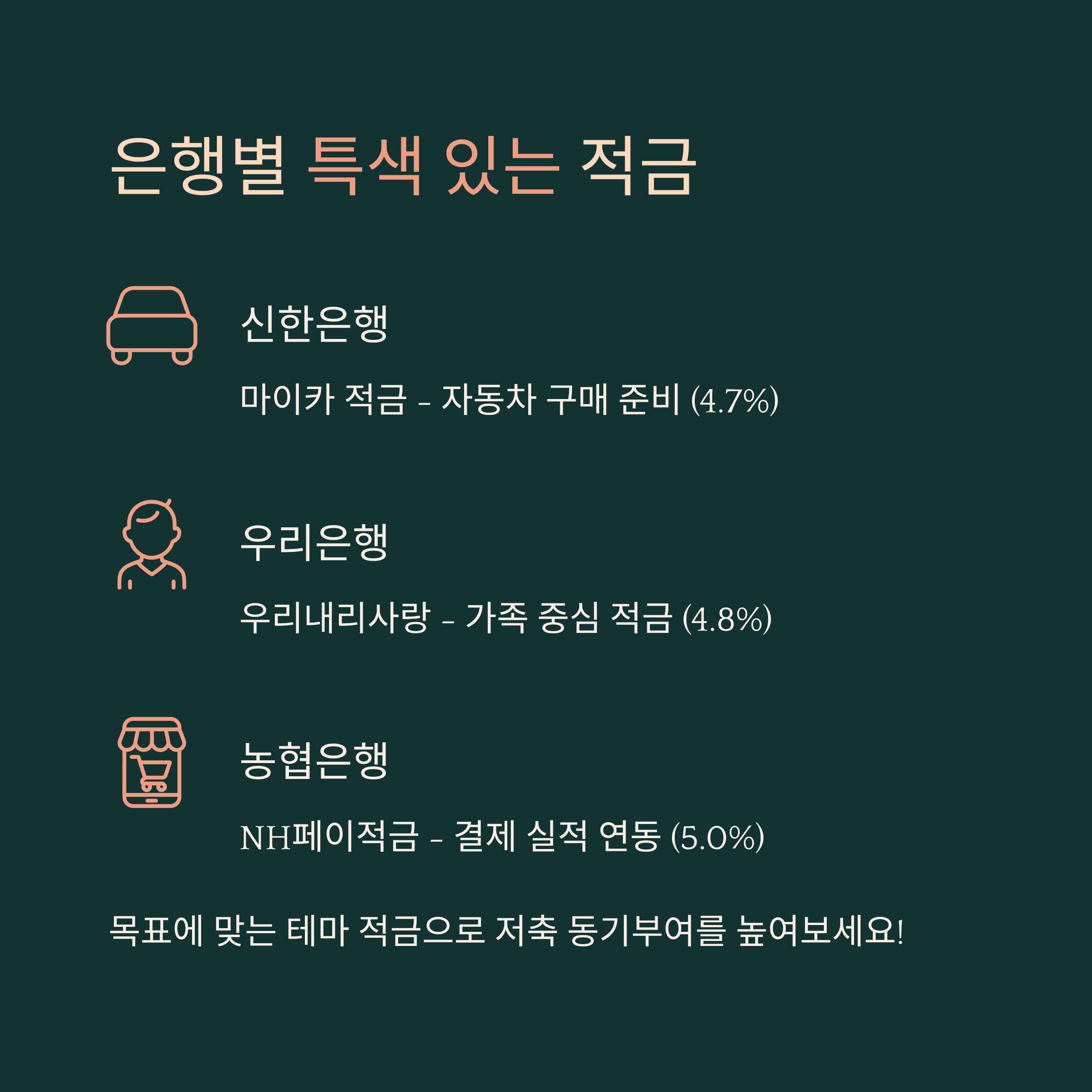 다음 섹션에서는 은행별로 어떤 특색 있는 적금이 있는지 비교해볼게요! 고금리뿐 아니라 재미있는 테마 적금도 많답니다