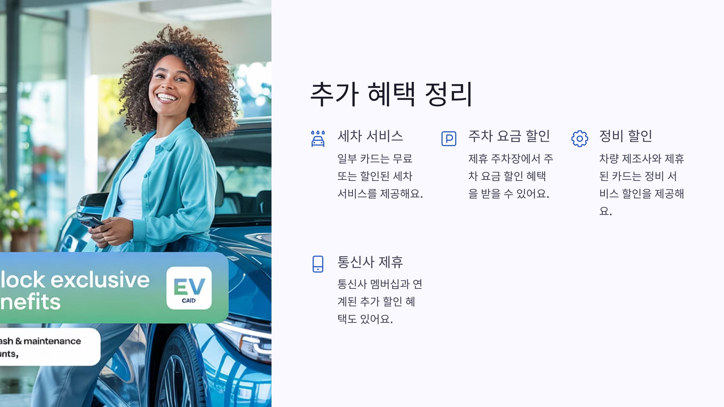 차량 연계 | 자동차 제조사와 연계된 혜택 (예: 현대 블루멤버스 등) |