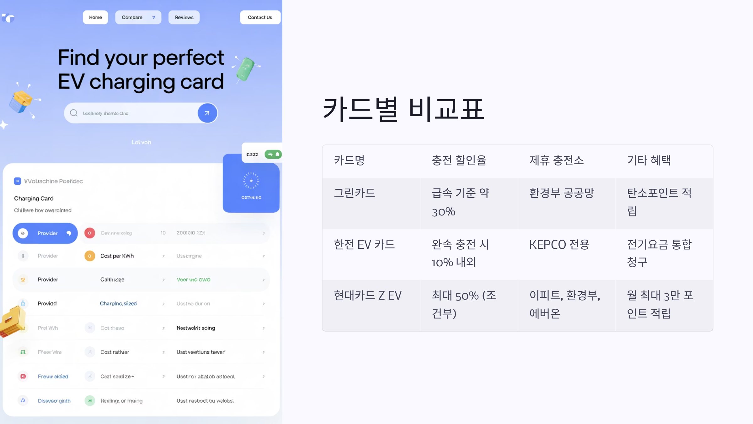 전기차 충전 카드는 한눈에 비교해보면 정말 차이가 뚜렷하게 보여요. 할인율은 얼마나 되는지, 어떤 충전소에서 사용할 수 있는지, 추가 혜택은 무엇인지 간단하게 정리해봤어요.