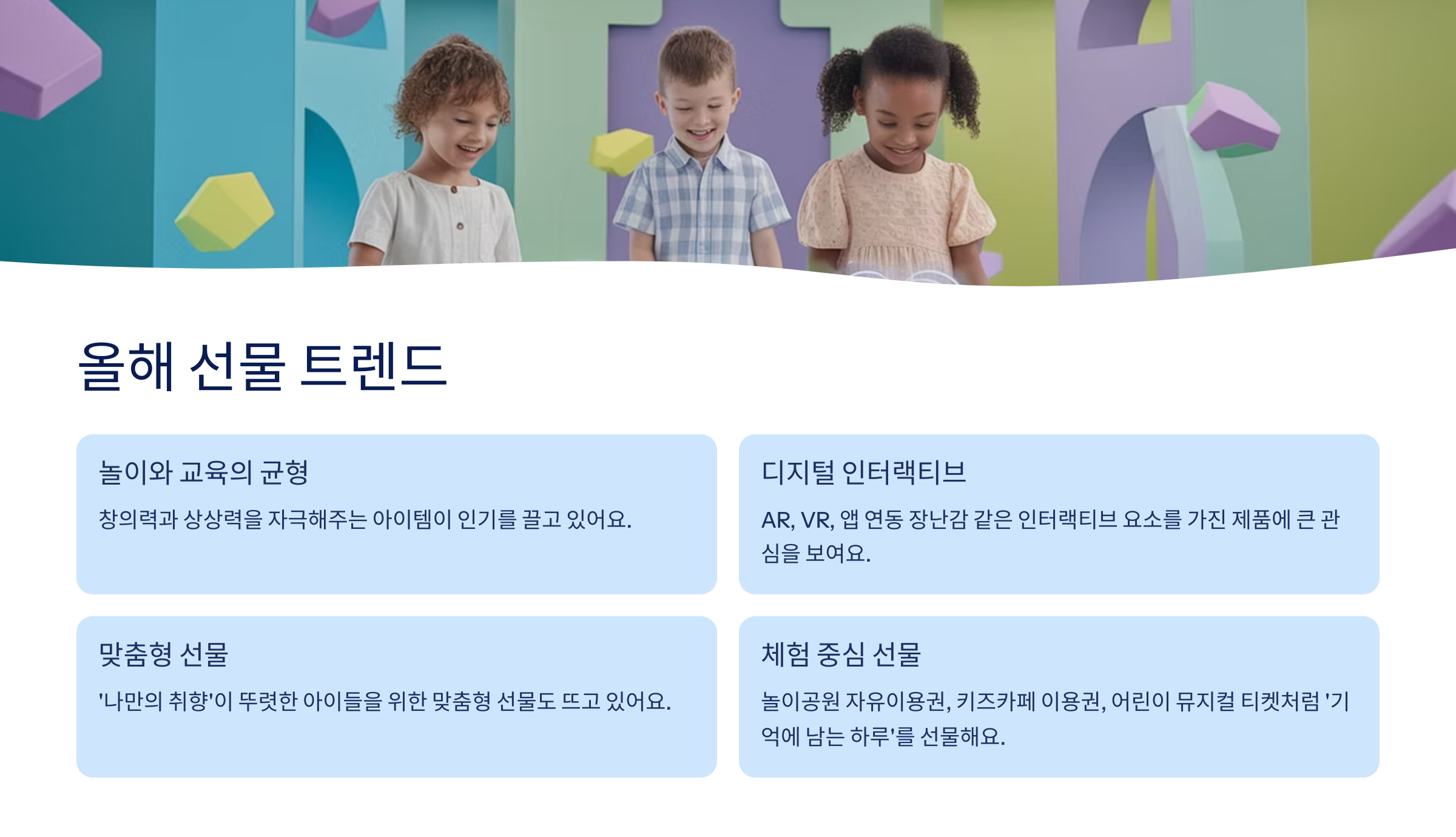 2025년 어린이날 선물 트렌드는 ‘놀이와 교육의 균형’이 핵심이에요. 단순히 재미만 주는 선물보다, 창의력과 상상력을 자극해주는 아이템이 인기를 끌고 있어요.