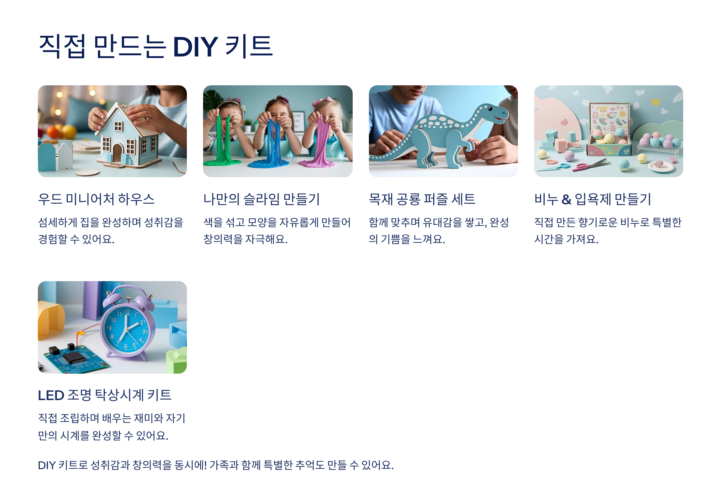 특히 부모님과 함께 만들 수 있는 DIY 키트는 아이와의 유대감 형성에도 정말 좋아요. ‘아빠랑 같이 만든 탁상시계’ 같은 기억은 평생 남을 거예요.