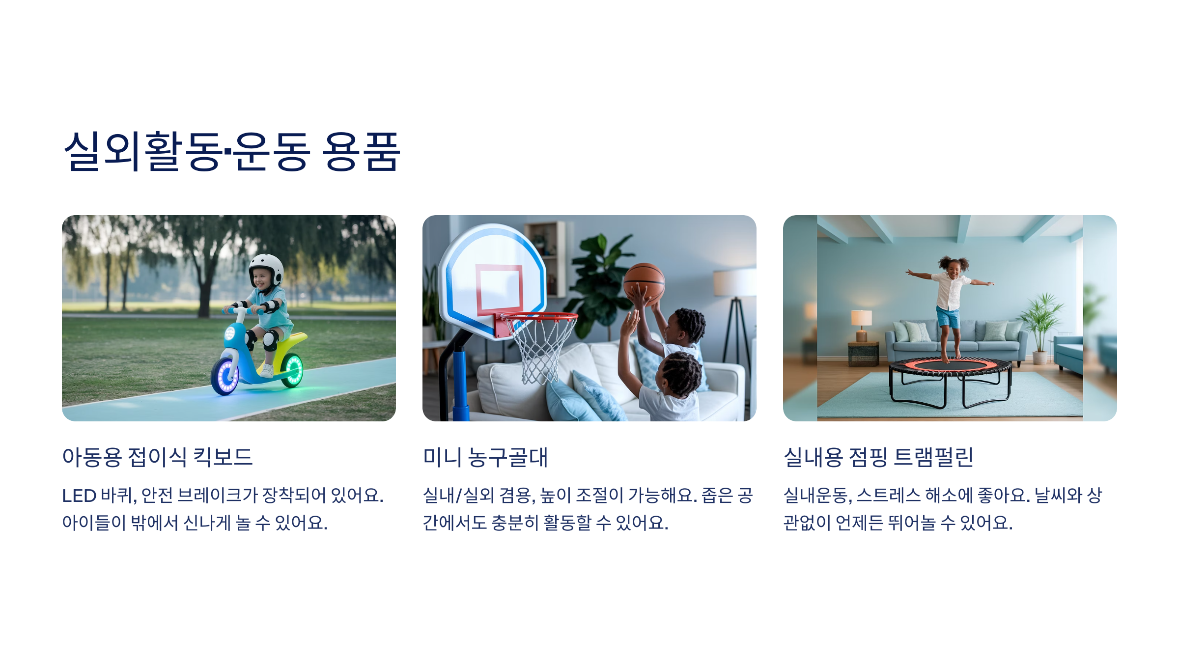 2025년에는 ‘놀이 + 운동’을 결합한 제품들이 큰 인기를 끌고 있어요. 점프 트램펄린, 유아 킥보드, 아동용 자전거, 미니 농구골대 등이 대표적이죠.