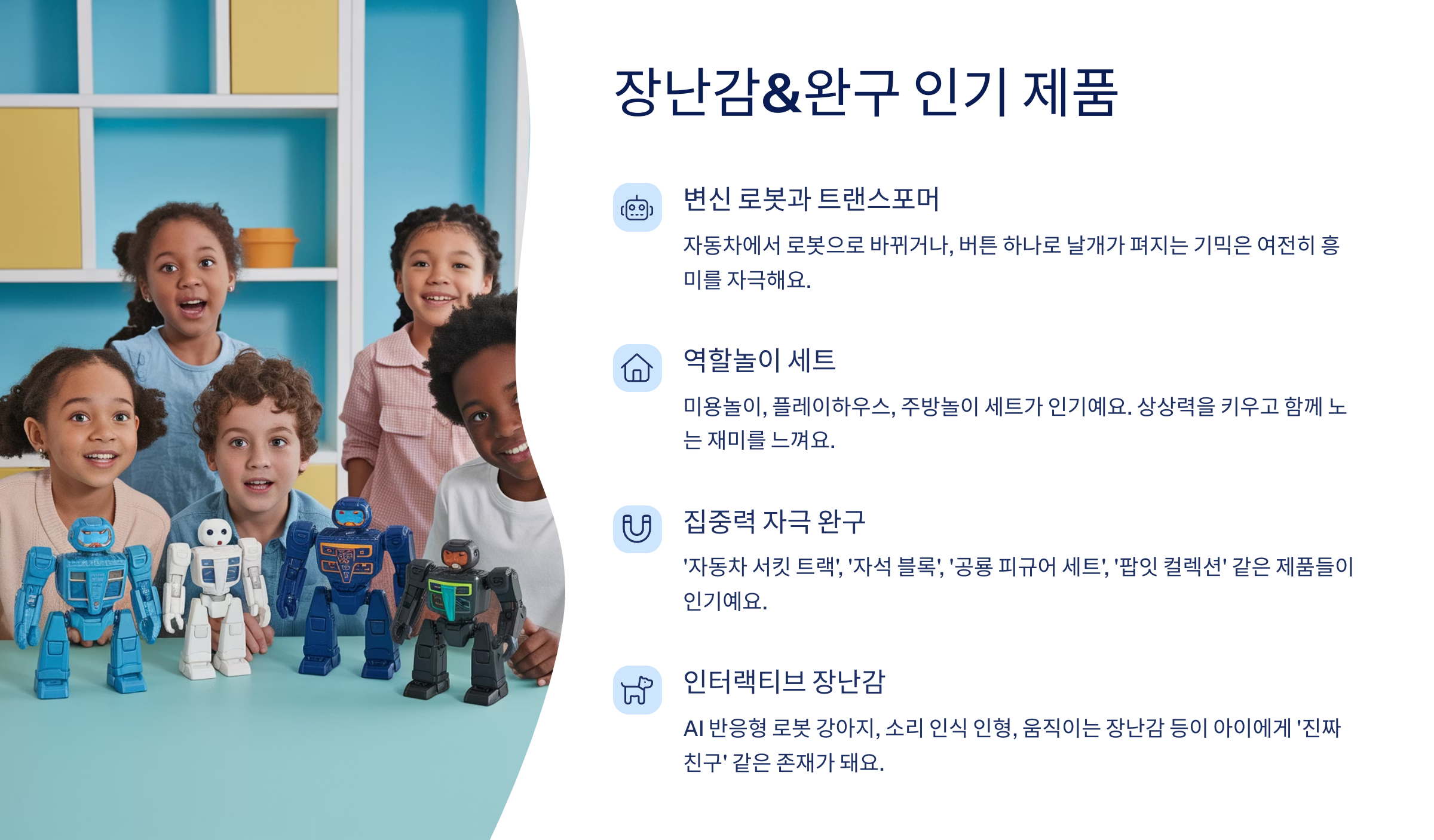 특히 디지털 네이티브 세대인 요즘 아이들은 AR, VR, 앱 연동 장난감 같은 인터랙티브 요소를 가진 제품에 큰 관심을 보여요. 또한 부모와 함께 즐길 수 있는 DIY 키트나 보드게임도 다시 주목받고 있어요.