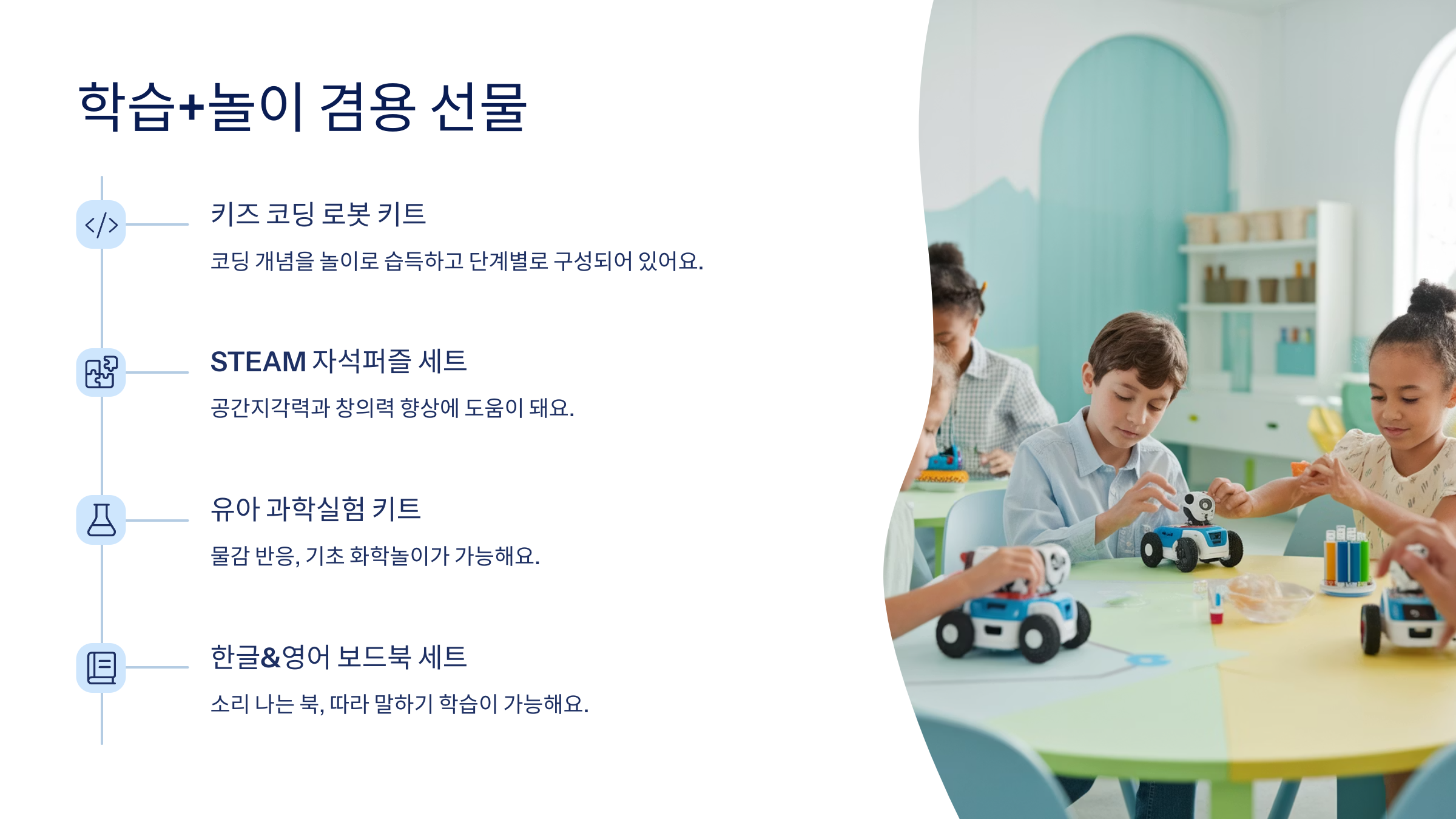 특히 코딩, 로봇, 퍼즐, 사고력 게임, 체험형 키트는 아이의 두뇌 발달과 문제 해결 능력을 높이는 데 효과적이에요.