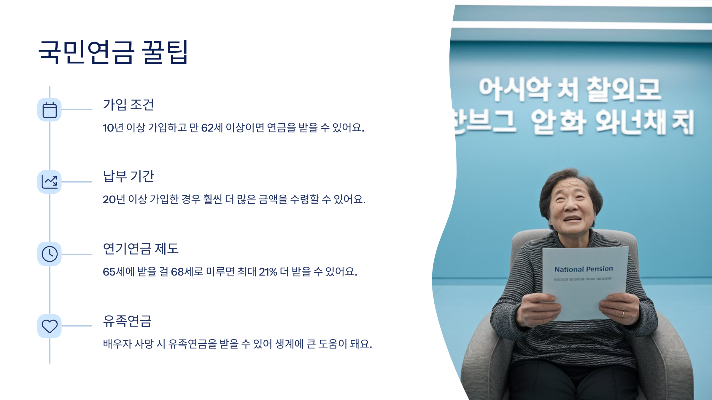 연금을 늦게 받을수록 매월 받는 금액은 올라가요. 예를 들어, 65세에 받을 걸 68세로 미루면 최대 21% 더 받을 수 있답니다. 이걸 ‘연기연금 제도’라고 해요.