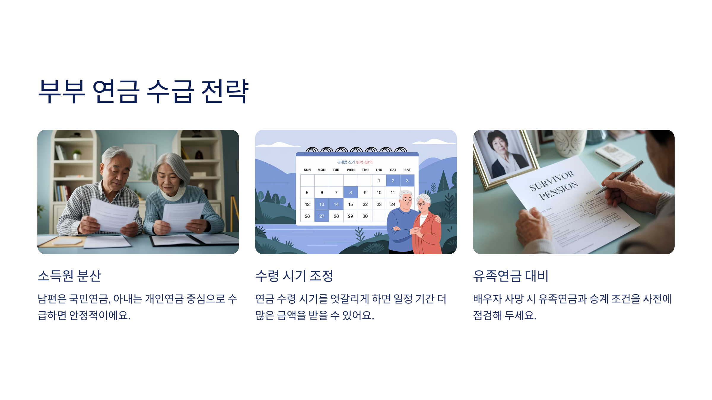 예를 들어 남편은 국민연금, 아내는 개인연금을 중심으로 수급할 수 있도록 분산하면 한쪽 연금에 문제가 생겨도 안정적인 생활이 가능해요. 소득원을 나누는 게 핵심이에요.