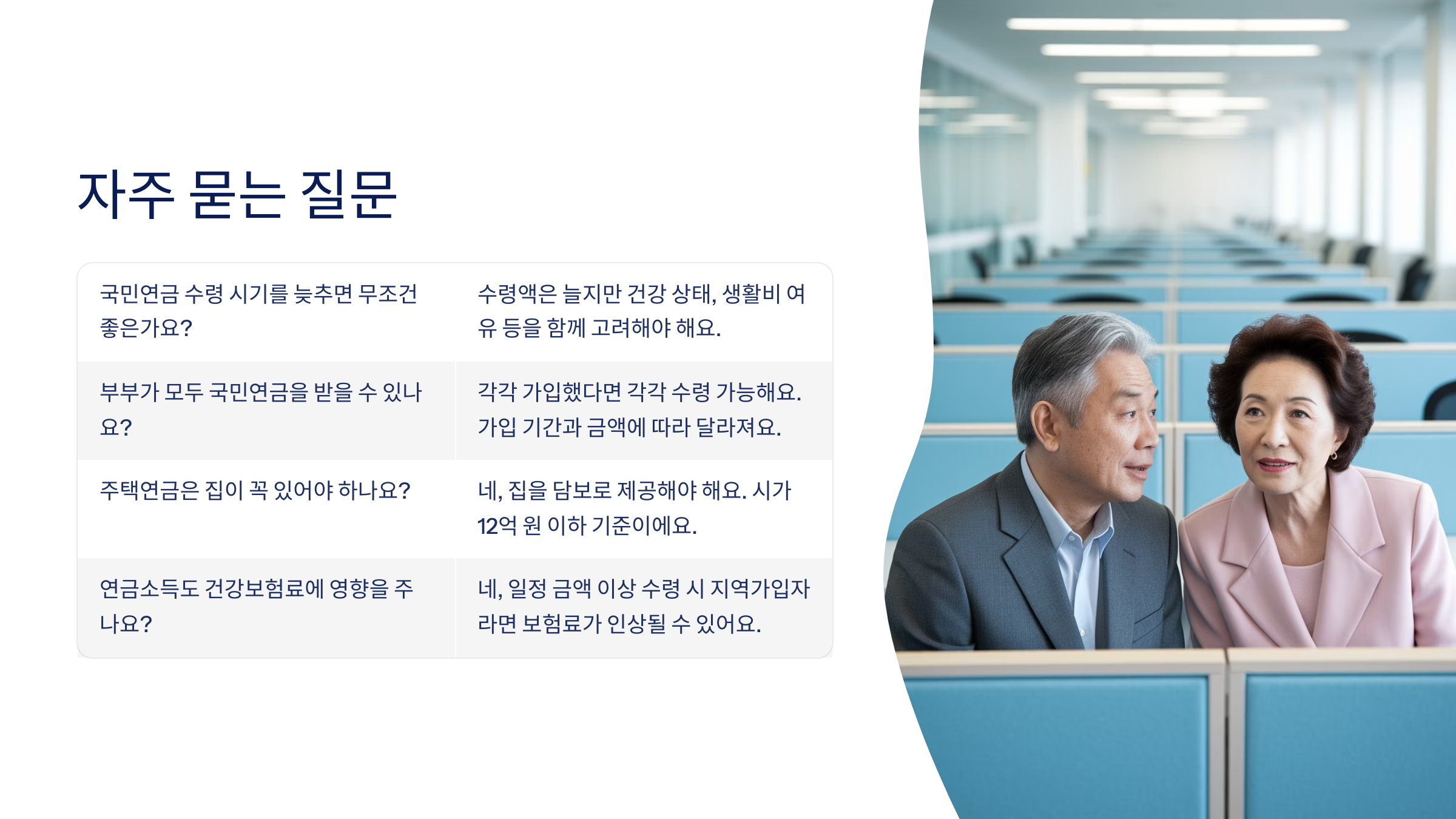 연금 수령 시기를 일부러 엇갈리게 하는 것도 전략 중 하나예요. 남편은 65세부터, 아내는 68세부터 수령하면 일정 기간 동안은 더 많은 금액을 수령하게 돼요. 이것이 바로 '연기연금 활용'이에요.